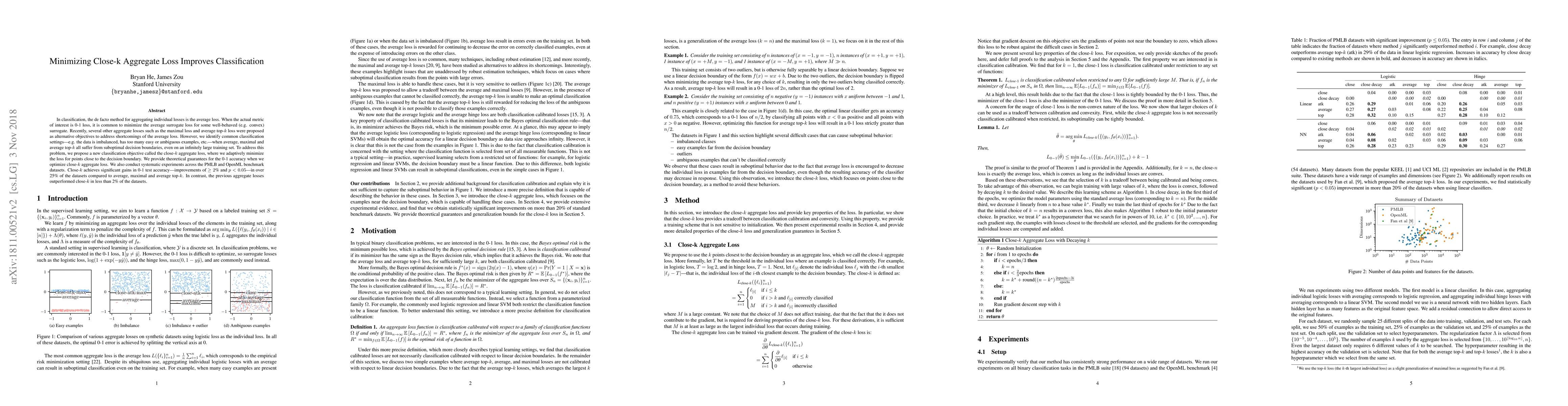 In classification, the de facto method for aggregating individual losses is the average loss. When the actual metric of interest is 0-1 loss, it is common to minimize the average surrogate loss for some well-behaved (e.g. convex) surrogate. Recently, several other aggregate losses such as the maximal loss and average top-$k$ loss were proposed as alternative objectives to address shortcomings of the average loss. However, we identify common classification settings, e.g. the data is imbalanced, has too many easy or ambiguous examples, etc., when average, maximal and average top-$k$ all suffer from suboptimal decision boundaries, even on an infinitely large training set. To address this problem, we propose a new classification objective called the close-$k$ aggregate loss, where we adaptively minimize the loss for points close to the decision boundary. We provide theoretical guarantees for the 0-1 accuracy when we optimize close-$k$ aggregate loss. We also conduct systematic experiments across the PMLB and OpenML benchmark datasets. Close-$k$ achieves significant gains in 0-1 test accuracy, improvements of $\geq 2$% and $p<0.05$, in over 25% of the datasets compared to average, maximal and average top-$k$. In contrast, the previous aggregate losses outperformed close-$k$ in less than 2% of the datasets.