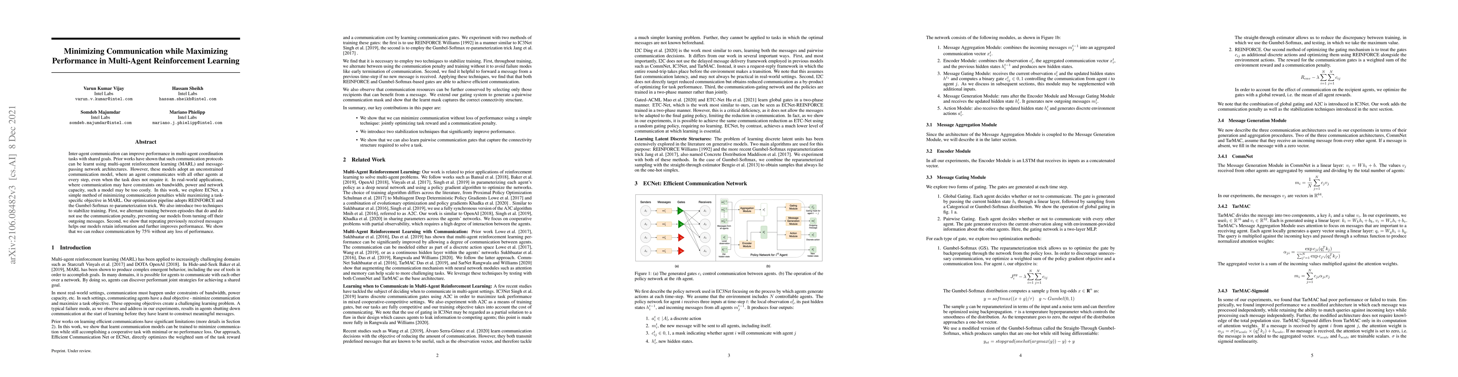 This paper proposes a method to minimize inter-agent communication in multi-agent reinforcement learning while maintaining performance, using a communication penalty and techniques like 50% training and message forwarding. They demonstrate that communication can be reduced by 75% without sacrificing task performance.