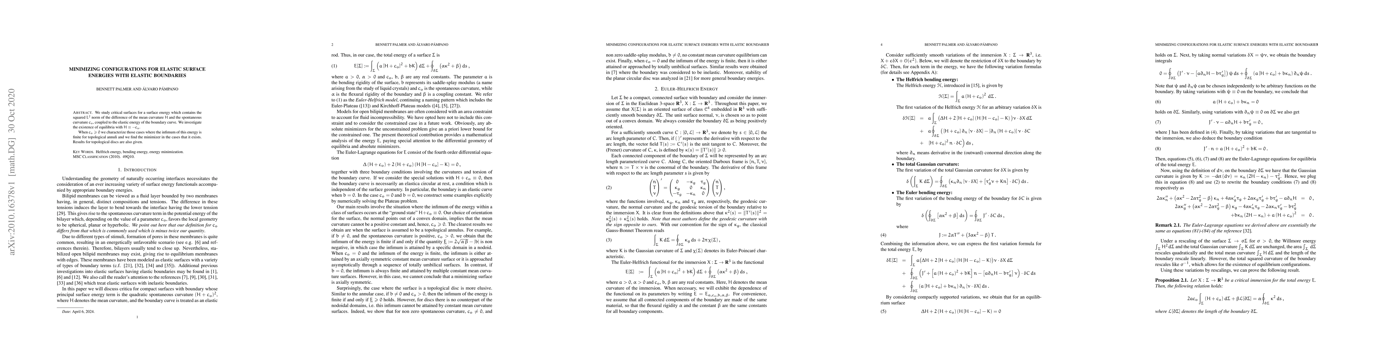 Researchers studied a surface energy that depends on the difference between mean curvature and spontaneous curvature, minimizing its configuration with elastic boundaries. They found conditions under which the minimum energy exists for certain shapes.