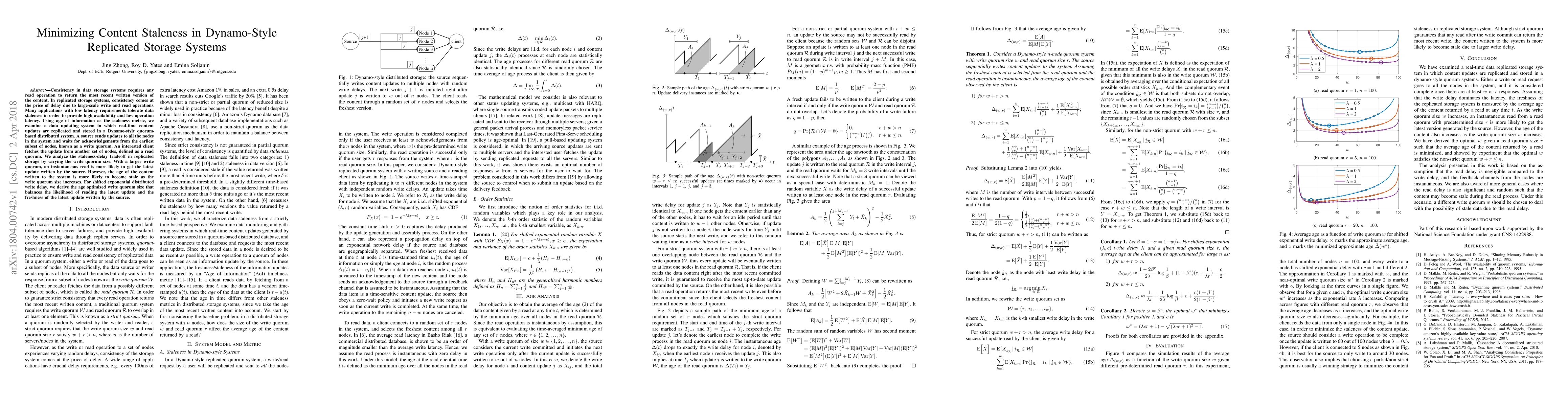 This paper investigates methods to minimize content staleness in Dynamo-style quorum-based distributed storage systems, focusing on the trade-off between data freshness and latency. It derives an optimized write quorum size that balances the likelihood of reading the latest update against the staleness of the content.