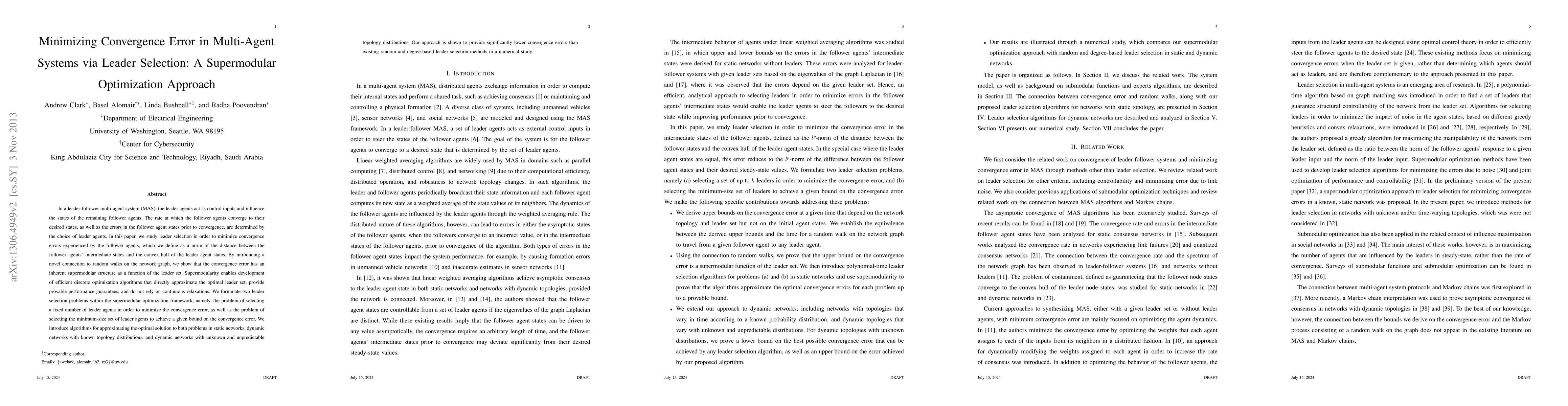 In a leader-follower multi-agent system (MAS), the leader agents act as control inputs and influence the states of the remaining follower agents. The rate at which the follower agents converge to their desired states, as well as the errors in the follower agent states prior to convergence, are determined by the choice of leader agents. In this paper, we study leader selection in order to minimize convergence errors experienced by the follower agents, which we define as a norm of the distance between the follower agents' intermediate states and the convex hull of the leader agent states. By introducing a novel connection to random walks on the network graph, we show that the convergence error has an inherent supermodular structure as a function of the leader set. Supermodularity enables development of efficient discrete optimization algorithms that directly approximate the optimal leader set, provide provable performance guarantees, and do not rely on continuous relaxations. We formulate two leader selection problems within the supermodular optimization framework, namely, the problem of selecting a fixed number of leader agents in order to minimize the convergence error, as well as the problem of selecting the minimum-size set of leader agents to achieve a given bound on the convergence error. We introduce algorithms for approximating the optimal solution to both problems in static networks, dynamic networks with known topology distributions, and dynamic networks with unknown and unpredictable topology distributions. Our approach is shown to provide significantly lower convergence errors than existing random and degree-based leader selection methods in a numerical study.