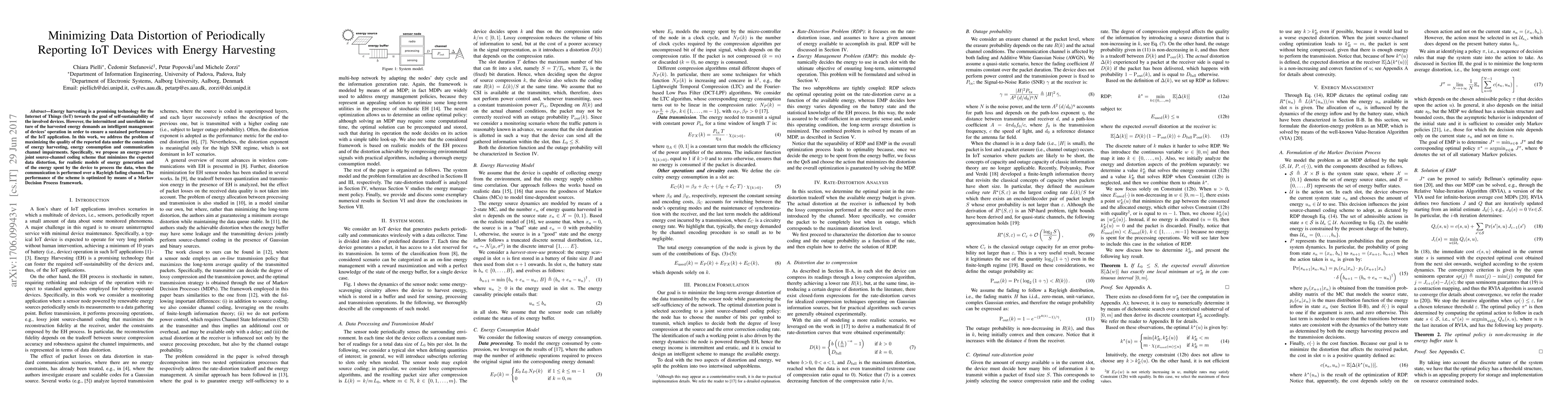This paper proposes an energy-aware joint source-channel coding scheme to minimize data distortion in IoT devices using energy harvesting, addressing the challenges of intermittent energy supply and communication channel impairments. The scheme is optimized using a Markov Decision Process framework to ensure sustained performance.