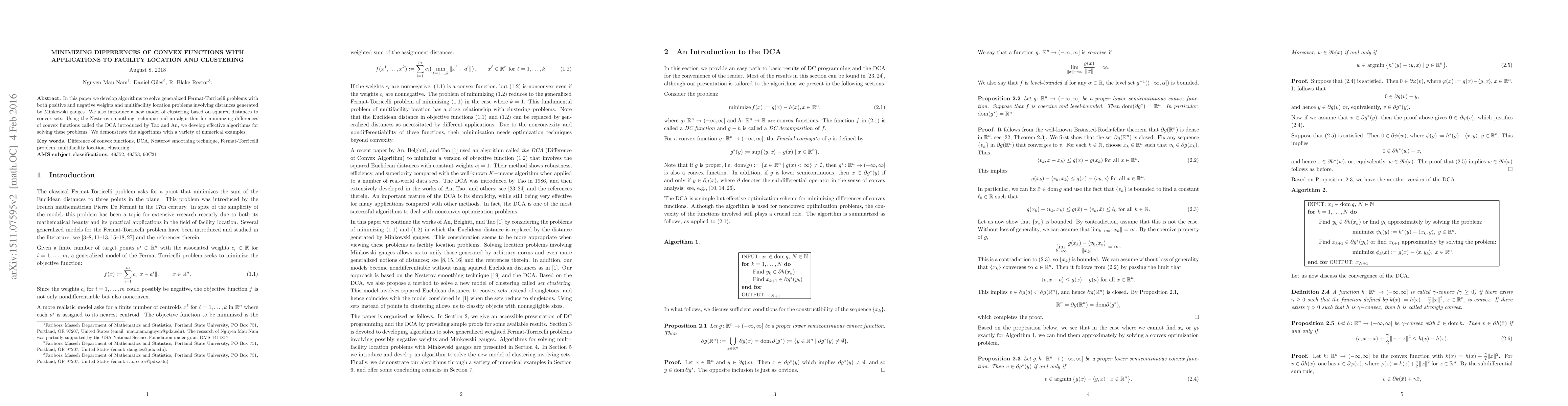 In this paper we develop algorithms to solve generalized weighted Fermat-Torricelli problems with positive and negative weights and multifacility location problems involving distances generated by Minkowski gauges. We also introduce a new model of clustering based on squared distances to convex sets. Using the Nesterov smoothing technique and an algorithm for minimizing differences of convex functions called the DCA introduced by Tao and An, we develop effective algorithms for solving these problems.