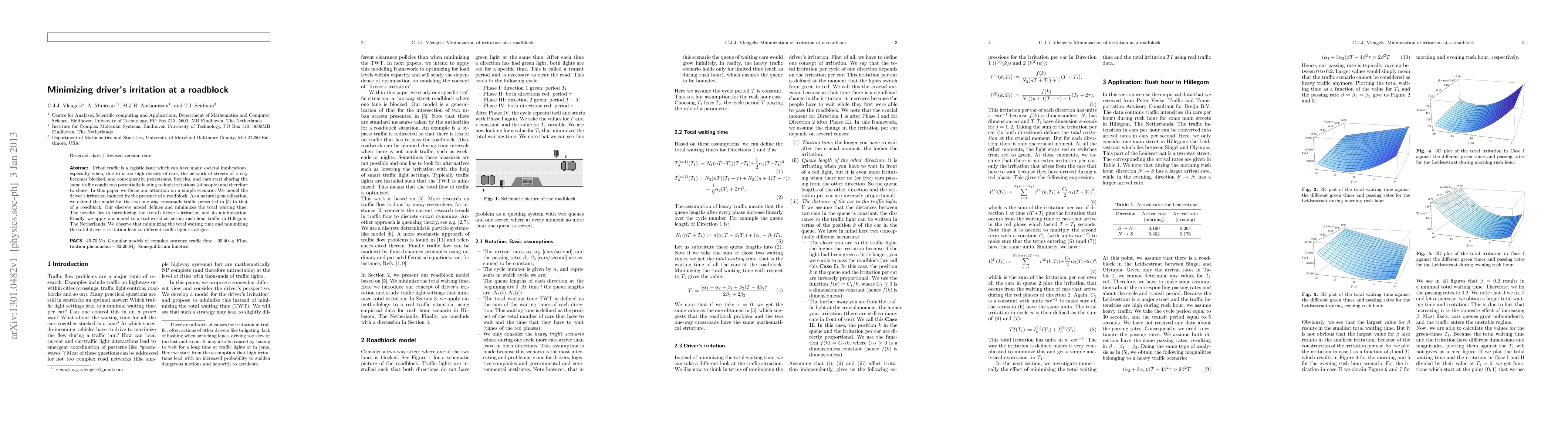 Urban traffic is a logistic issue which can have many societal implications, especially when, due to a too high density of cars, the network of streets of a city becomes blocked, and consequently, pedestrians, bicycles, and cars start sharing the same traffic conditions potentially leading to high irritations (of people) and therefore to chaos. In this paper we focus our attention on a simple scenario: We model the driver's irritation induced by the presence of a roadblock. As a natural generalization, we extend the model for the two one-way crossroads traffic presented by M.E. Fouladvand and M. Nematollahi to that of a roadblock. Our discrete model defines and minimizes the total waiting time. The novelty lies in introducing the (total) driver's irritation and its minimization. Finally, we apply our model to a real-world situation: rush hour traffic in Hillegom, The Netherlands. We observe that minimizing the total waiting time and minimizing the total driver's irritation lead to different traffic light strategies.
