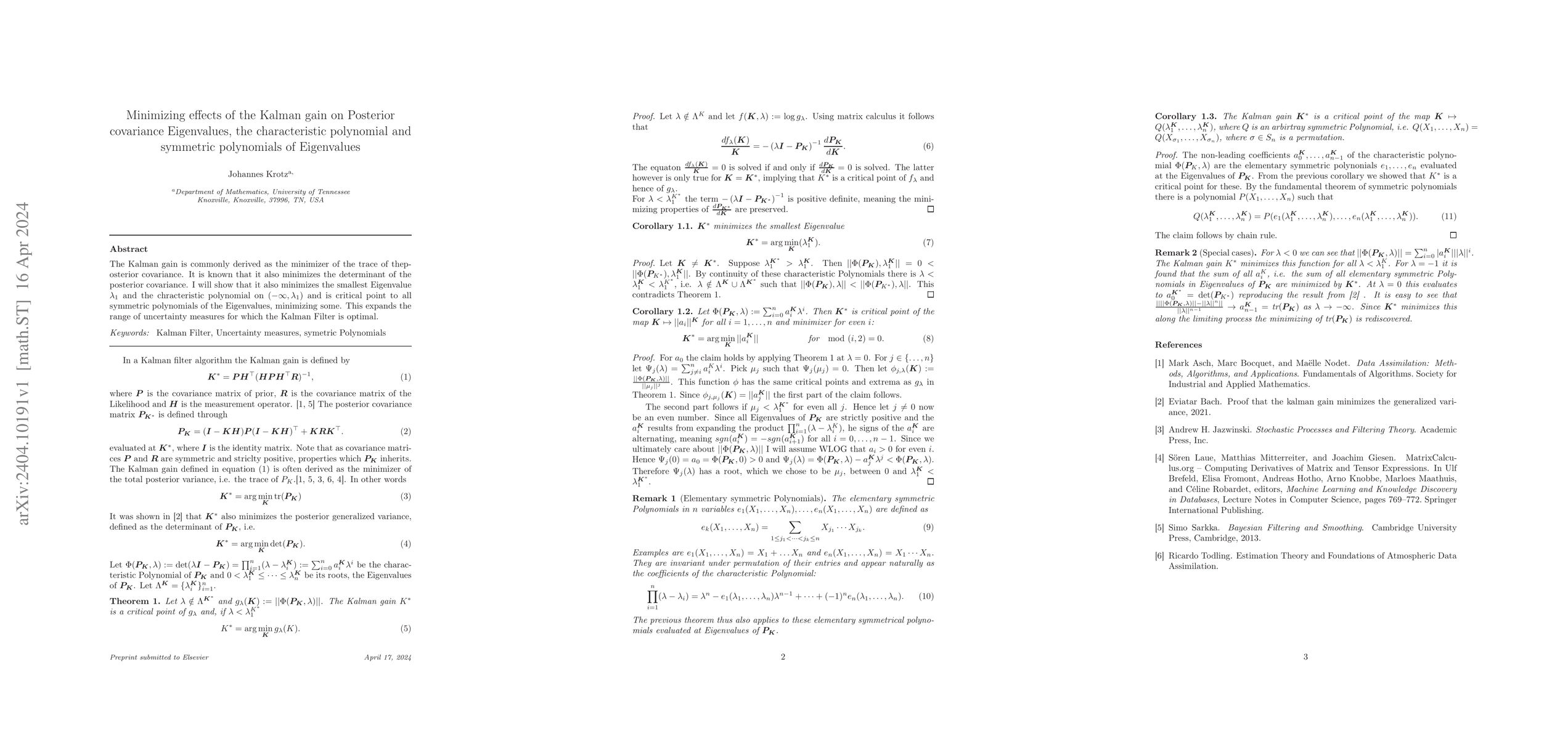 The Kalman gain is commonly derived as the minimizer of the trace of theposterior covariance. It is known that it also minimizes the determinant of the posterior covariance. I will show that it also minimizes the smallest Eigenvalue $\lambda_1$ and the chracteristic polynomial on $(-\infty,\lambda_1)$ and is critical point to all symmetric polynomials of the Eigenvalues, minimizing some. This expands the range of uncertainty measures for which the Kalman Filter is optimal.