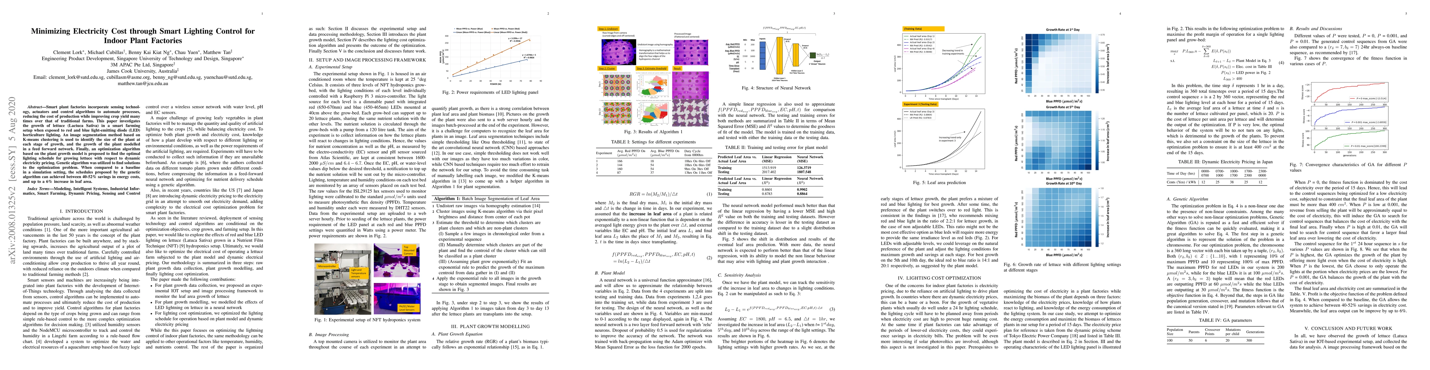 Smart plant factories incorporate sensing technology, actuators and control algorithms to automate processes, reducing the cost of production while improving crop yield many times over that of traditional farms. This paper investigates the growth of lettuce (Lactuca Sativa) in a smart farming setup when exposed to red and blue light-emitting diode (LED) horticulture lighting. An image segmentation method based on K-means clustering is used to identify the size of the plant at each stage of growth, and the growth of the plant modelled in a feed forward network. Finally, an optimization algorithm based on the plant growth model is proposed to find the optimal lighting schedule for growing lettuce with respect to dynamic electricity pricing. Genetic algorithm was utilized to find solutions to the optimization problem. When compared to a baseline in a simulation setting, the schedules proposed by the genetic algorithm can achieved between 40-52% savings in energy costs, and up to a 6% increase in leaf area.