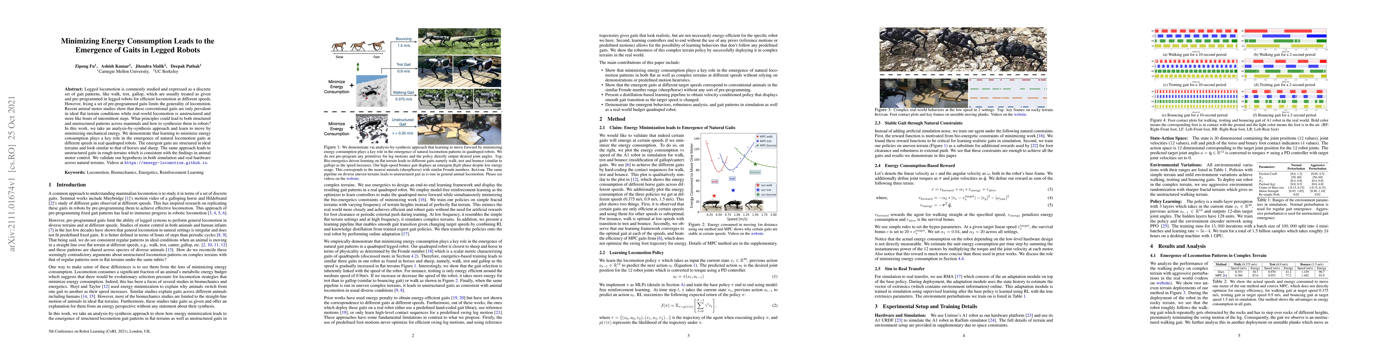 This paper explores how minimizing mechanical energy consumption can lead to the emergence of natural gaits in legged robots, demonstrating structured gaits in ideal terrains and unstructured gaits in rough terrains, mirroring animal locomotion patterns. The study validates this approach through both simulation and real-world robot experiments.