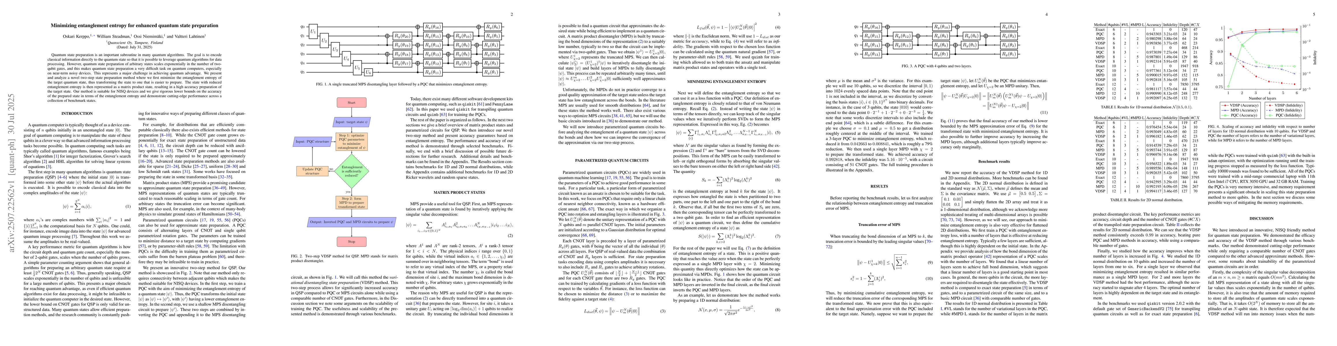 The research introduces a novel two-step method for quantum state preparation, minimizing entanglement entropy to transform the target state into one that is easier to prepare. This transformed state is then represented as a matrix product state (MPS) for high-accuracy preparation.