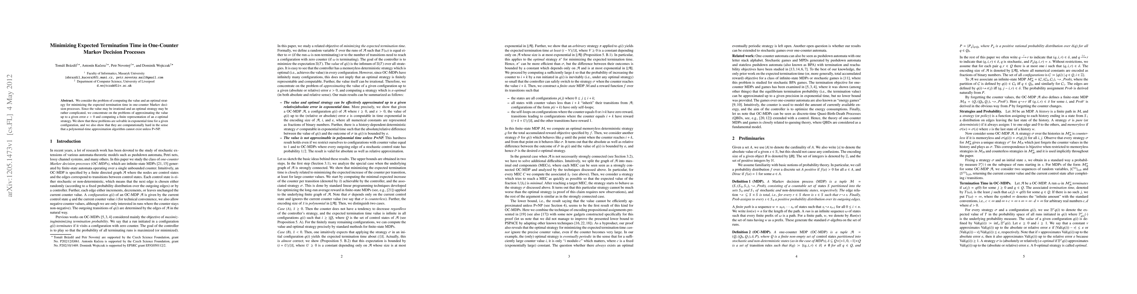 This paper addresses the challenge of minimizing expected termination time in one-counter Markov decision processes, focusing on approximation methods for value computation and epsilon-optimal strategy representation. It demonstrates that while these problems can be solved in exponential time, no polynomial-time approximation algorithms exist unless P=NP.