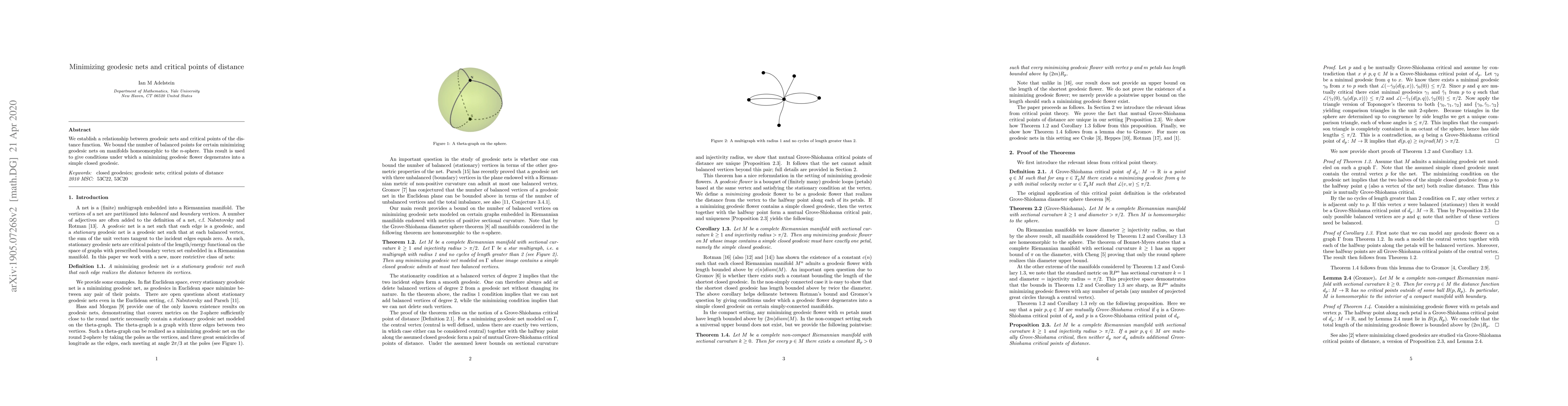 This paper establishes a connection between geodesic nets and critical points of the distance function, providing bounds on the number of balanced points and the length for minimizing geodesic nets on $n$-sphere manifolds.
