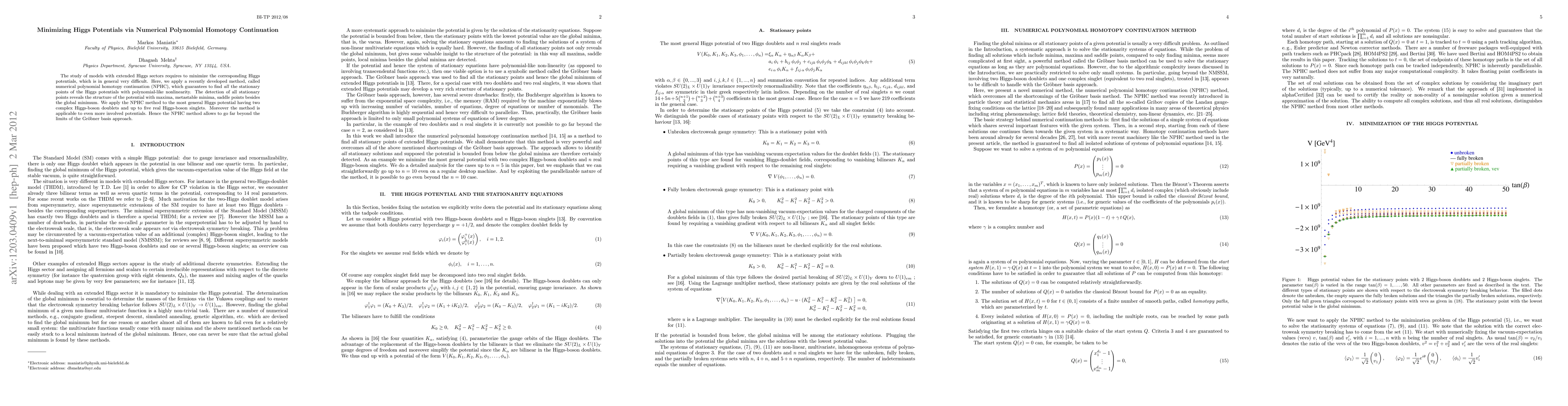 The study of models with extended Higgs sectors requires to minimize the corresponding Higgs potentials, which is in general very difficult. Here, we apply a recently developed method, called numerical polynomial homotopy continuation (NPHC), which guarantees to find all the stationary points of the Higgs potentials with polynomial-like nonlinearity. The detection of all stationary points reveals the structure of the potential with maxima, metastable minima, saddle points besides the global minimum. We apply the NPHC method to the most general Higgs potential having two complex Higgs-boson doublets and up to five real Higgs-boson singlets. Moreover the method is applicable to even more involved potentials. Hence the NPHC method allows to go far beyond the limits of the Gr\"obner basis approach.