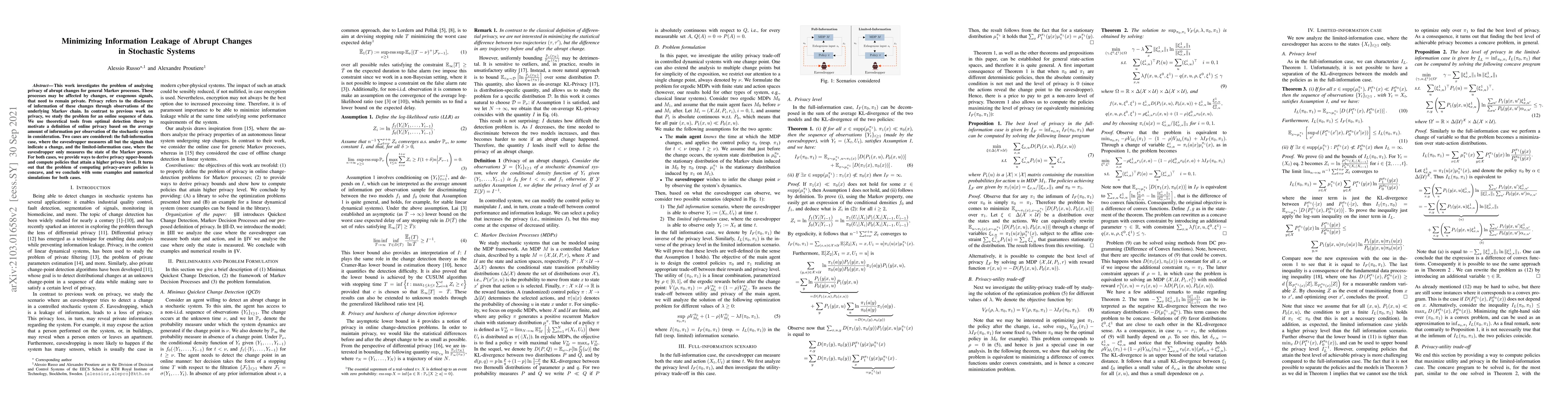 This work investigates the problem of analyzing privacy of abrupt changes for general Markov processes. These processes may be affected by changes, or exogenous signals, that need to remain private. Privacy refers to the disclosure of information of these changes through observations of the underlying Markov chain. In contrast to previous work on privacy, we study the problem for an online sequence of data. We use theoretical tools from optimal detection theory to motivate a definition of online privacy based on the average amount of information per observation of the stochastic system in consideration. Two cases are considered: the full-information case, where the eavesdropper measures all but the signals that indicate a change, and the limited-information case, where the eavesdropper only measures the state of the Markov process. For both cases, we provide ways to derive privacy upper-bounds and compute policies that attain a higher privacy level. It turns out that the problem of computing privacy-aware policies is concave, and we conclude with some examples and numerical simulations for both cases.