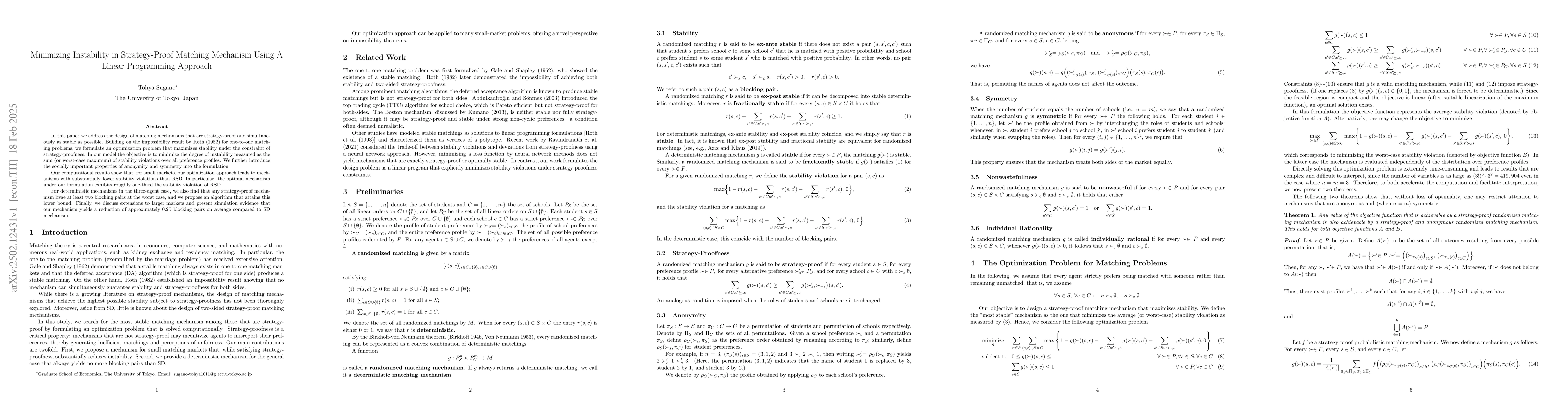 The paper introduces a linear programming formulation to minimize instability in strategy-proof matching mechanisms, ensuring anonymity and symmetry, and demonstrates its effectiveness through computational results.