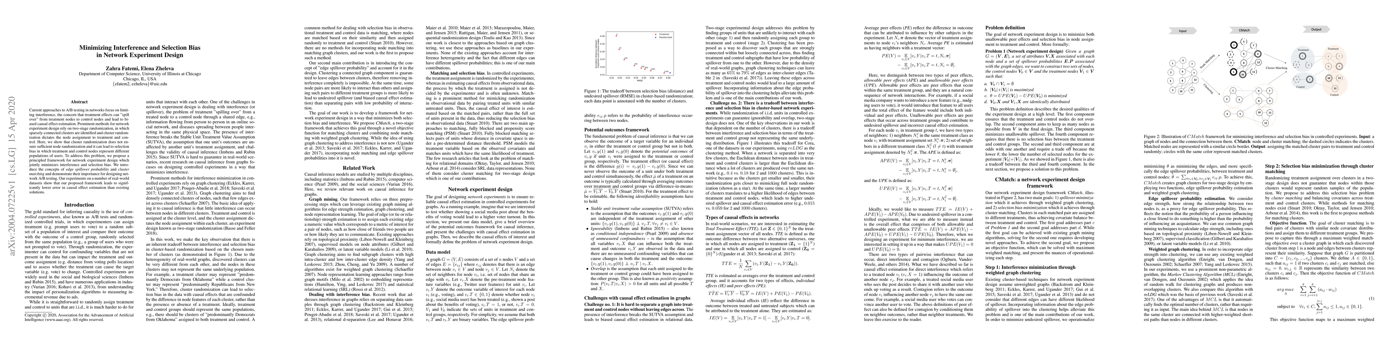 This paper critiques existing network experiment designs for A/B testing, highlighting that cluster randomization can lead to selection bias. It proposes a new framework that jointly minimizes interference and selection bias using edge spillover probability and cluster matching, demonstrating improved causal effect estimation accuracy on real-world datasets.