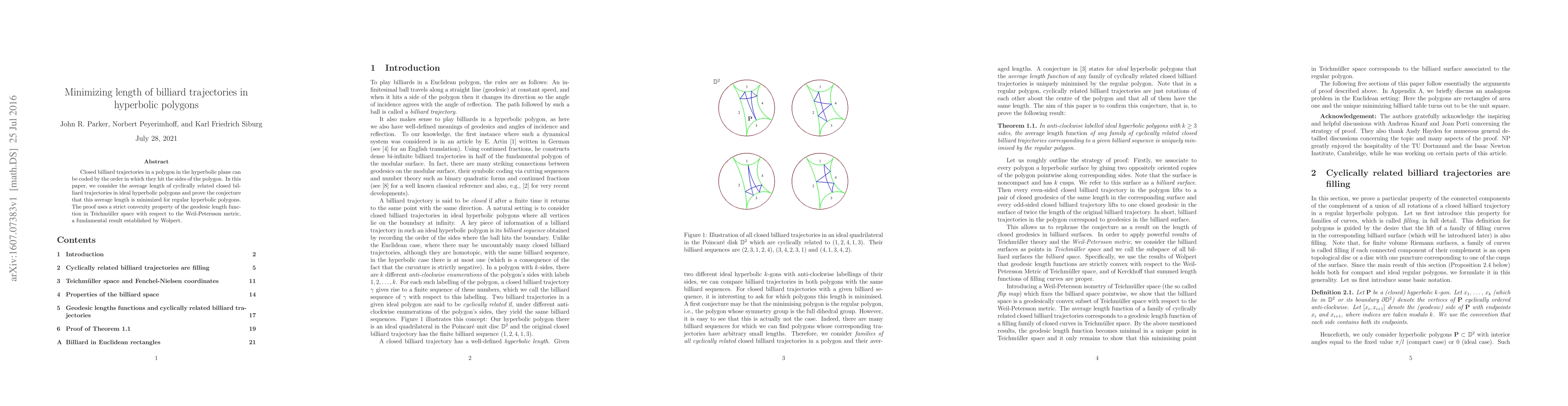 Closed billiard trajectories in a polygon in the hyperbolic plane can be coded by the order in which they hit the sides of the polygon. In this paper, we consider the average length of cyclically related closed billiard trajectories in ideal hyperbolic polygons and prove the conjecture that this average length is minimized for regular hyperbolic polygons. The proof uses a strict convexity property of the geodesic length function in Teichm\"uller space with respect to the Weil-Petersson metric, a fundamental result established by Wolpert.