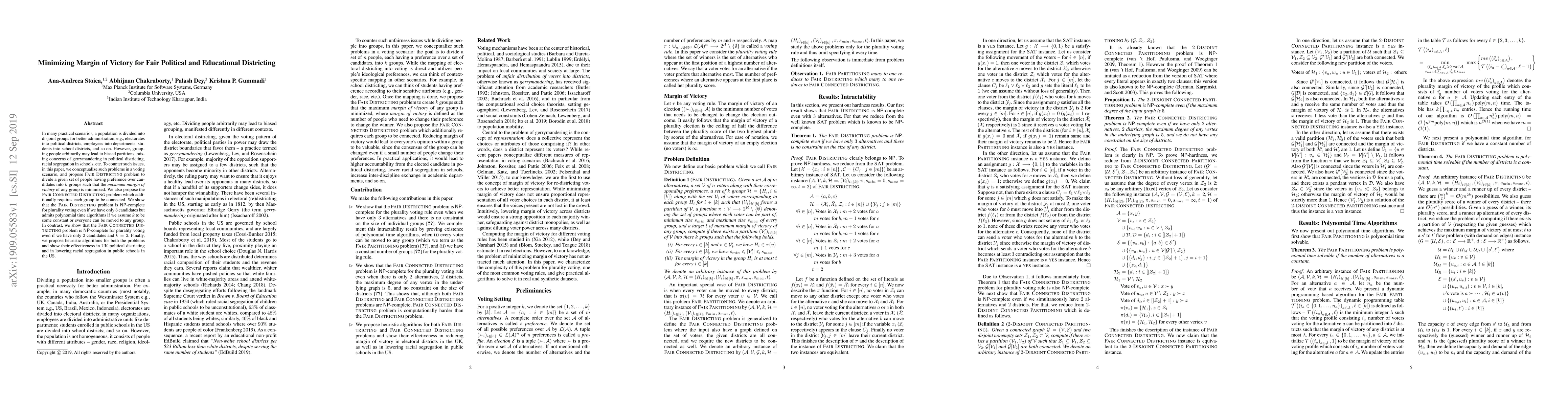 This paper proposes the FAIR DISTRICTING problem to minimize the maximum margin of victory in political and educational districting, aiming to prevent gerrymandering and segregation. It also introduces the FAIR CONNECTED DISTRICTING problem, which requires districts to be connected, and presents heuristic algorithms demonstrating their effectiveness in real-world applications.
