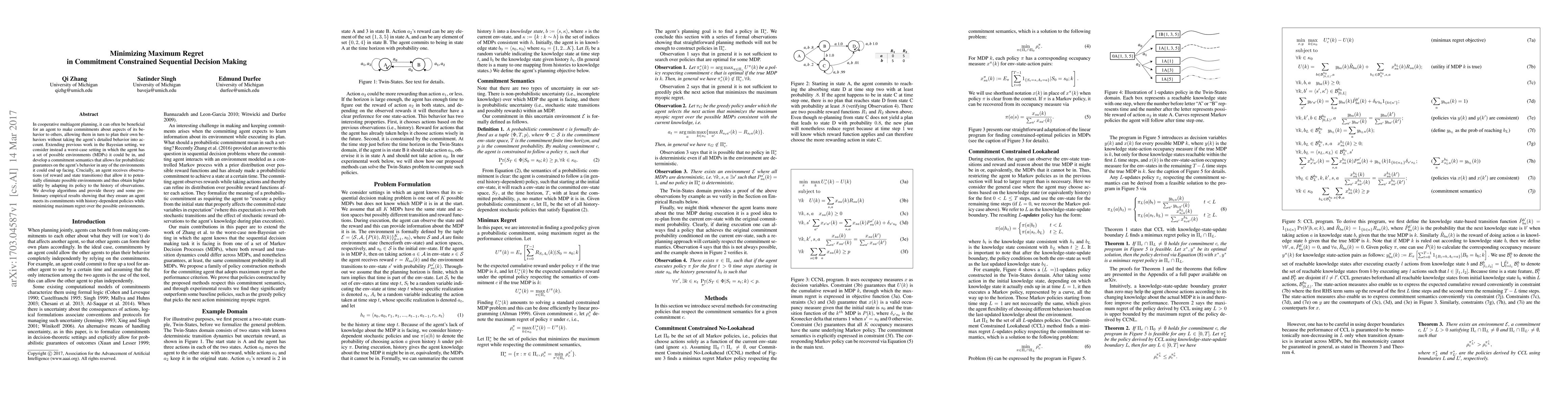 This paper develops a framework for multiagent planning where agents make commitments to their behavior, allowing others to plan accordingly. It introduces algorithms that minimize maximum regret while ensuring commitments are met under uncertain environments, balancing adaptability based on observations with commitment constraints.