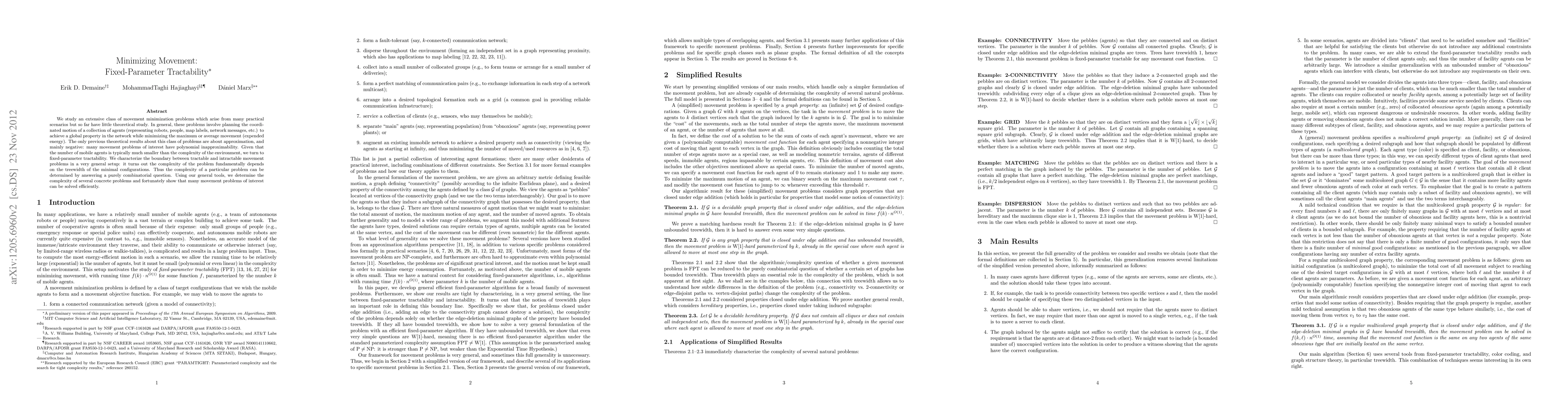 This paper explores the fixed-parameter tractability of movement minimization problems involving multiple agents, revealing that problem complexity hinges on the treewidth of minimal configurations. It demonstrates that many practical movement problems can be solved efficiently by leveraging combinatorial insights.
