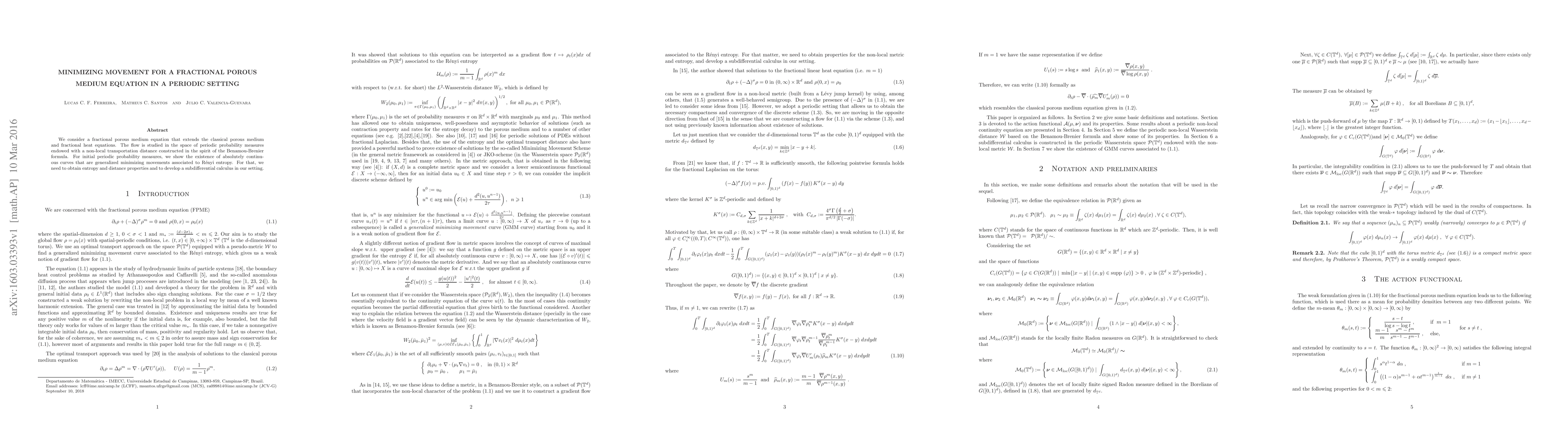 We consider a fractional porous medium equation that extends the classical porous medium and fractional heat equations. The flow is studied in the space of periodic probability measures endowed with a non-local transportation distance constructed in the spirit of the Benamou-Brenier formula. For initial periodic probability measures, we show the existence of absolutely continuous curves that are generalized minimizing movements associated to R\'enyi entropy. For that, we need to obtain entropy and distance properties and to develop a subdifferential calculus in our setting.