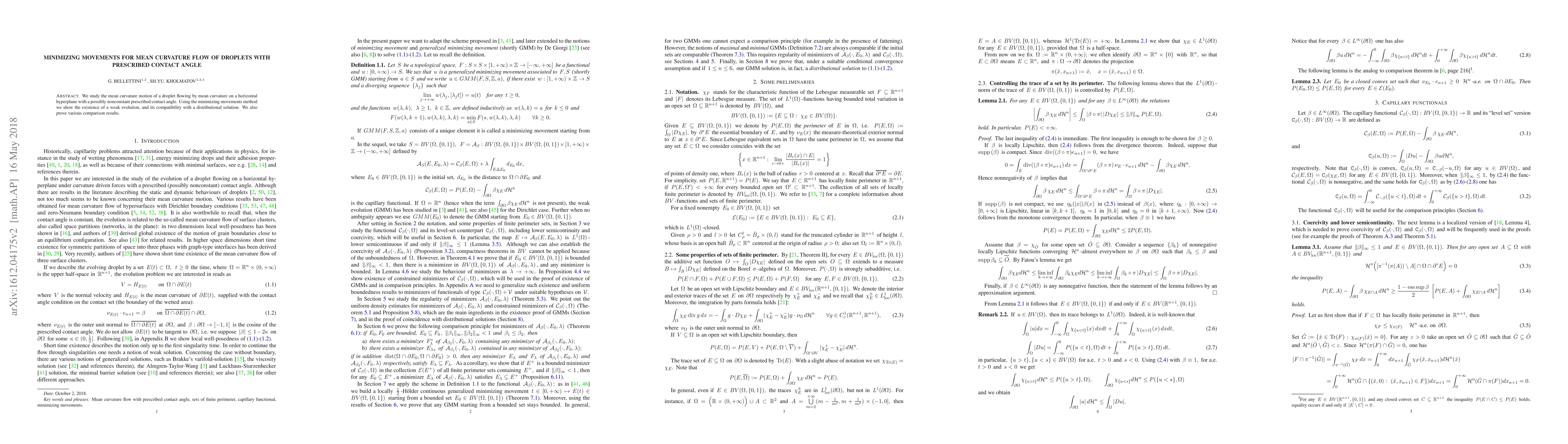 We study the mean curvature motion of a droplet flowing by mean curvature on a horizontal hyperplane with a possibly nonconstant prescribed contact angle. Using the minimizing movements method we show the existence of a weak evolution, and its compatibility with a distributional solution. We also prove various comparison results.