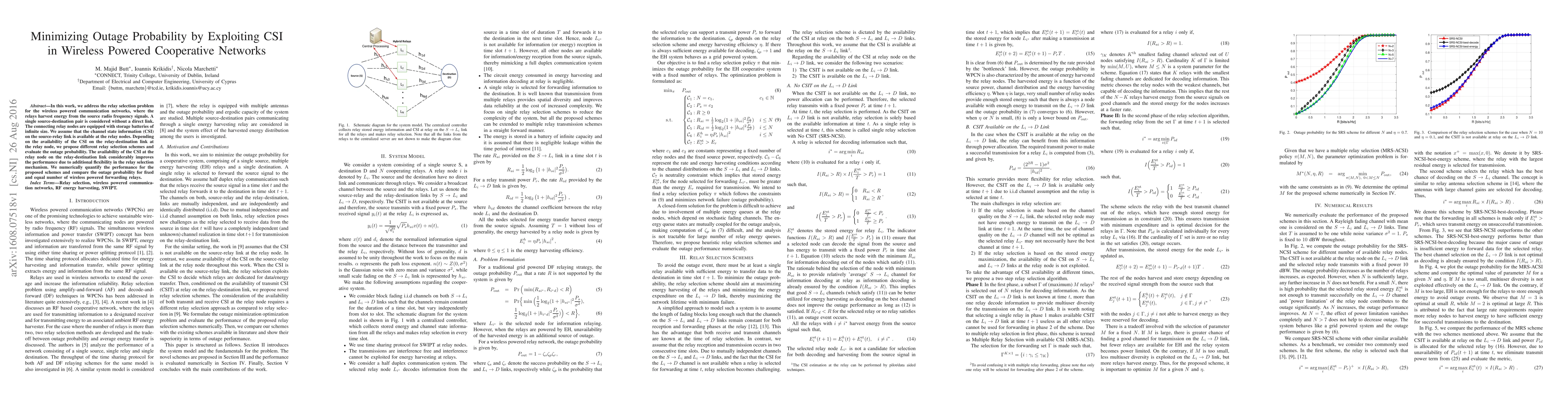 In this work, we address the relay selection problem for the wireless powered communication networks, where the relays harvest energy from the source radio frequency signals. A single source-destination pair is considered without a direct link. The connecting relay nodes are equipped with storage batteries of infinite size. We assume that the channel state information (CSI) on the source-relay link is available at the relay nodes. Depending on the availability of the CSI on the relay-destination link at the relay node, we propose different relay selection schemes and evaluate the outage probability. The availability of the CSI at the relay node on the relay-destination link considerably improves the performance due to additional flexibility in the relay selection mechanism. We numerically quantify the performance for the proposed schemes and compare the outage probability for fixed and equal number of wireless powered forwarding relays.