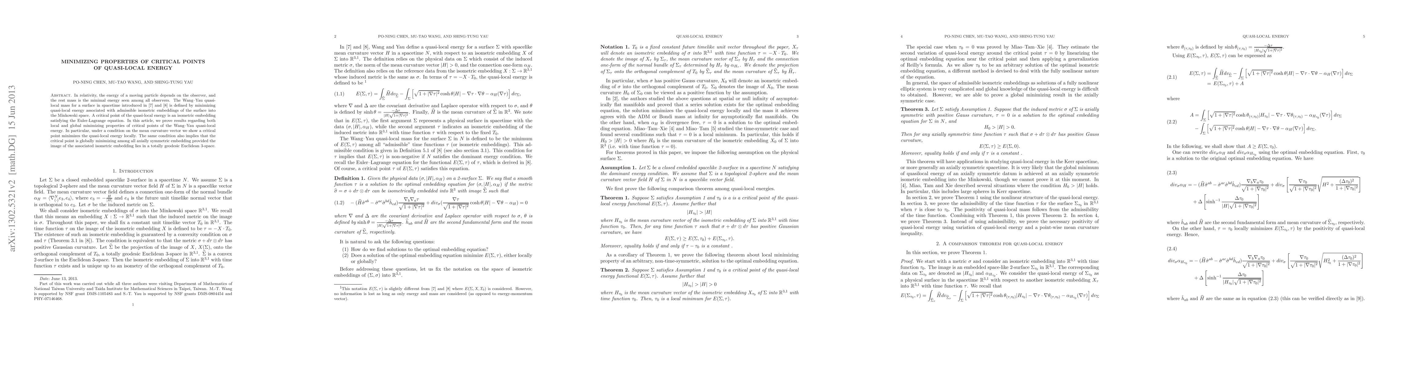 In relativity, the energy of a moving particle depends on the observer, and the rest mass is the minimal energy seen among all observers. The Wang-Yau quasi-local mass for a surface in spacetime introduced in [7] and [8] is defined by minimizing quasi-local energy associated with admissible isometric embeddings of the surface into the Minkowski space. A critical point of the quasi-local energy is an isometric embedding satisfying the Euler-Lagrange equation. In this article, we prove results regarding both local and global minimizing properties of critical points of the Wang-Yau quasi-local energy. In particular, under a condition on the mean curvature vector we show a critical point minimizes the quasi-local energy locally. The same condition also implies that the critical point is globally minimizing among all axially symmetric embedding provided the image of the associated isometric embedding lies in a totally geodesic Euclidean 3-space.