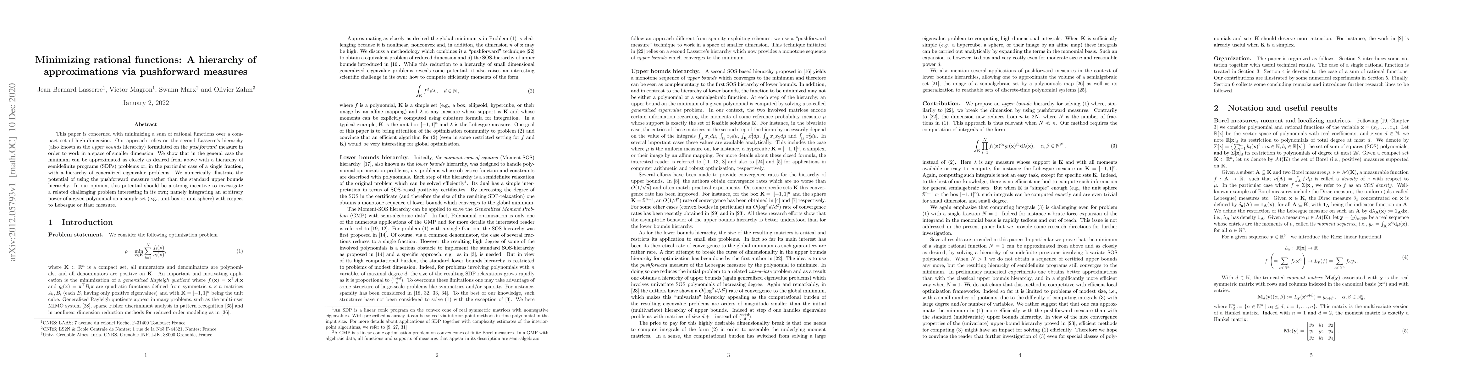 This paper is concerned with minimizing a sum of rational functions over a compact set of high-dimension. Our approach relies on the second Lasserre's hierarchy (also known as the upper bounds hierarchy) formulated on the pushforward measure in order to work in a space of smaller dimension. We show that in the general case the minimum can be approximated as closely as desired from above with a hierarchy of semidefinite programs problems or, in the particular case of a single fraction, with a hierarchy of generalized eigenvalue problems. We numerically illustrate the potential of using the pushforward measure rather than the standard upper bounds hierarchy. In our opinion, this potential should be a strong incentive to investigate a related challenging problem interesting in its own; namely integrating an arbitrary power of a given polynomial on a simple set (e.g., unit box or unit sphere) with respect to Lebesgue or Haar measure.