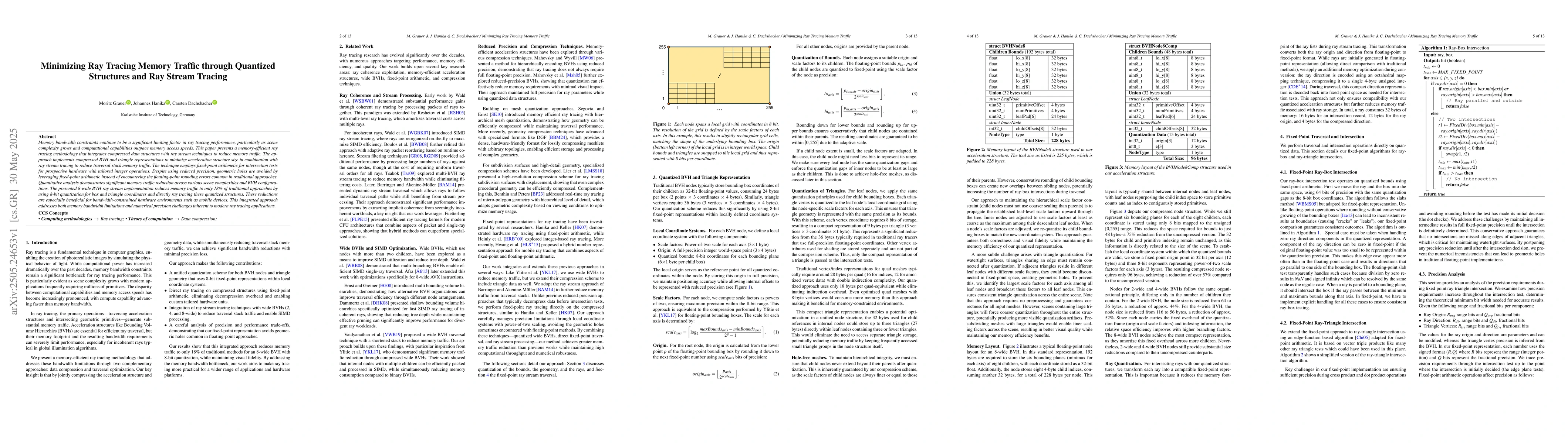 The paper's main technical contribution is an integrated system combining compressed bounding volume hierarchies (BVHs), ray stream tracing, and fixed-point arithmetic for intersection tests, leading to significant memory traffic reduction with manageable visual impact.