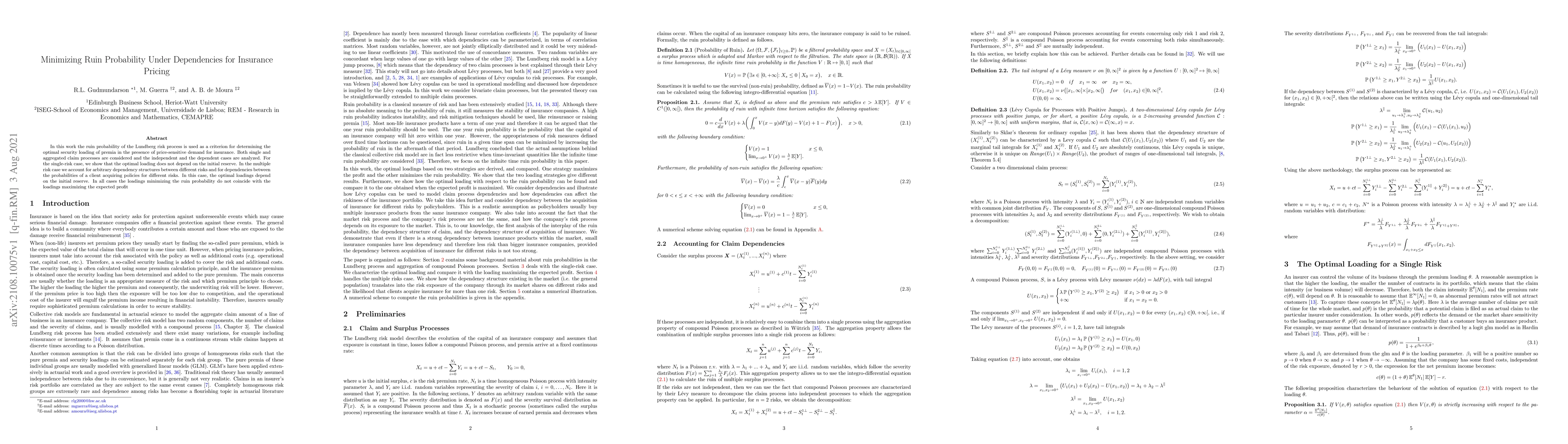 In this work the ruin probability of the Lundberg risk process is used as a criterion for determining the optimal security loading of premia in the presence of price-sensitive demand for insurance. Both single and aggregated claim processes are considered and the independent and the dependent cases are analyzed. For the single-risk case, we show that the optimal loading does not depend on the initial reserve. In the multiple risk case we account for arbitrary dependency structures between different risks and for dependencies between the probabilities of a client acquiring policies for different risks. In this case, the optimal loadings depend on the initial reserve. In all cases the loadings minimizing the ruin probability do not coincide with the loadings maximizing the expected profit.