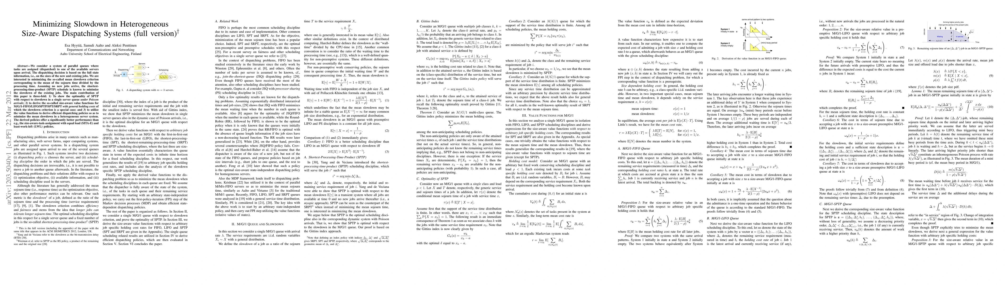 A study investigates how to minimize slowdown in a system of parallel queues with heterogeneous servers, proposing an SPTP schedule as the optimal policy and deriving size-aware value functions for efficient dispatching policies.