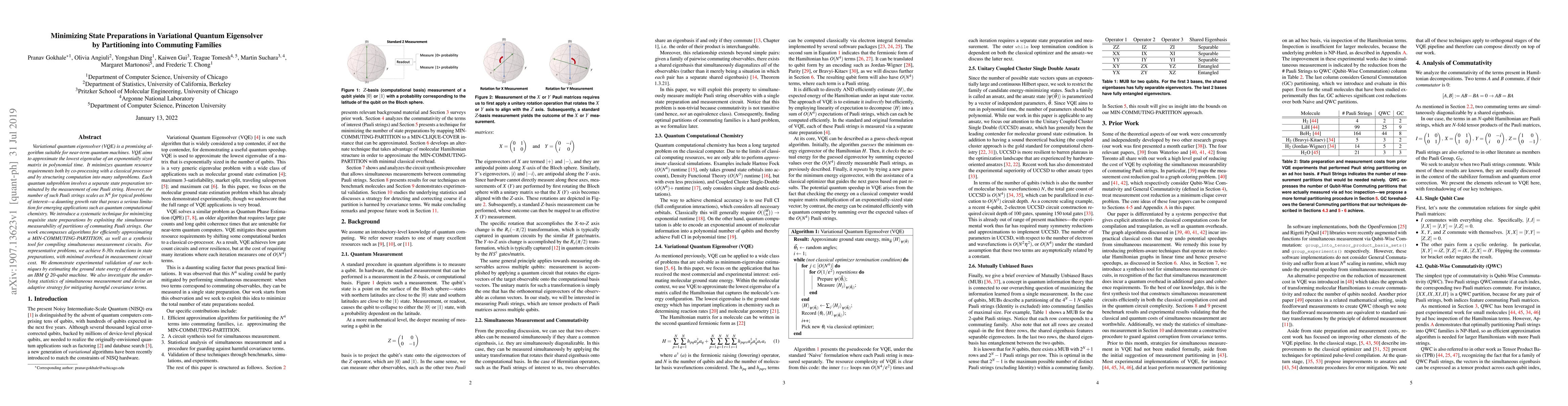 This paper proposes a method to reduce the number of state preparations in the variational quantum eigensolver (VQE) by partitioning Pauli strings into commuting families, achieving significant reductions in state preparations with minimal additional measurement cost. Experimental validation on an IBM Q 20-qubit machine demonstrates the effectiveness of the approach.
