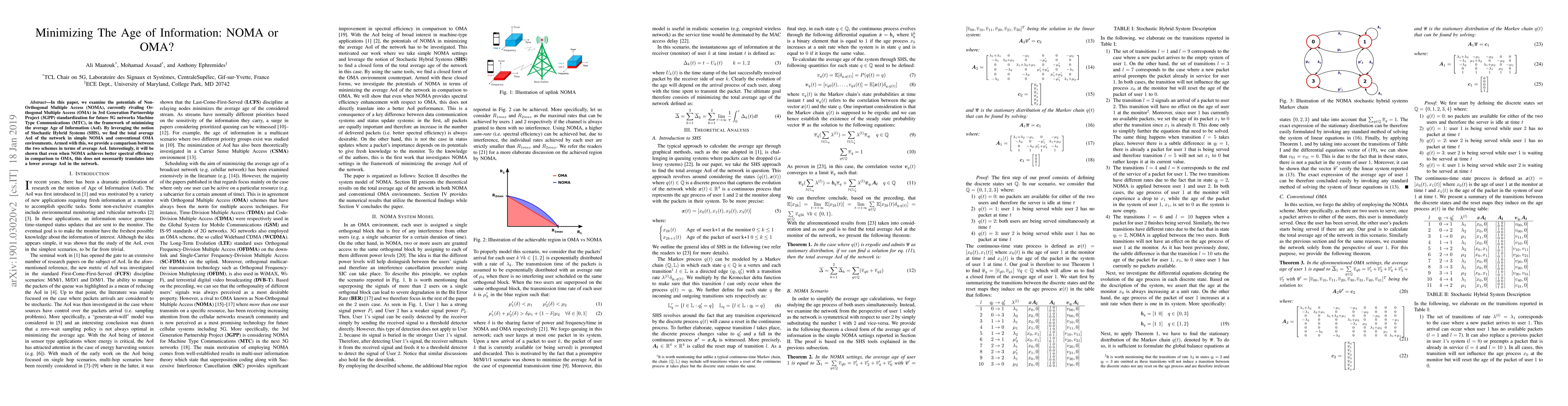 This paper compares Non-Orthogonal Multiple Access (NOMA) and Orthogonal Multiple Access (OMA) for minimizing the average Age of Information (AoI) in future 5G networks. Despite NOMA's superior spectral efficiency, it does not always result in a lower average AoI compared to OMA, as shown through the analysis using Stochastic Hybrid Systems.