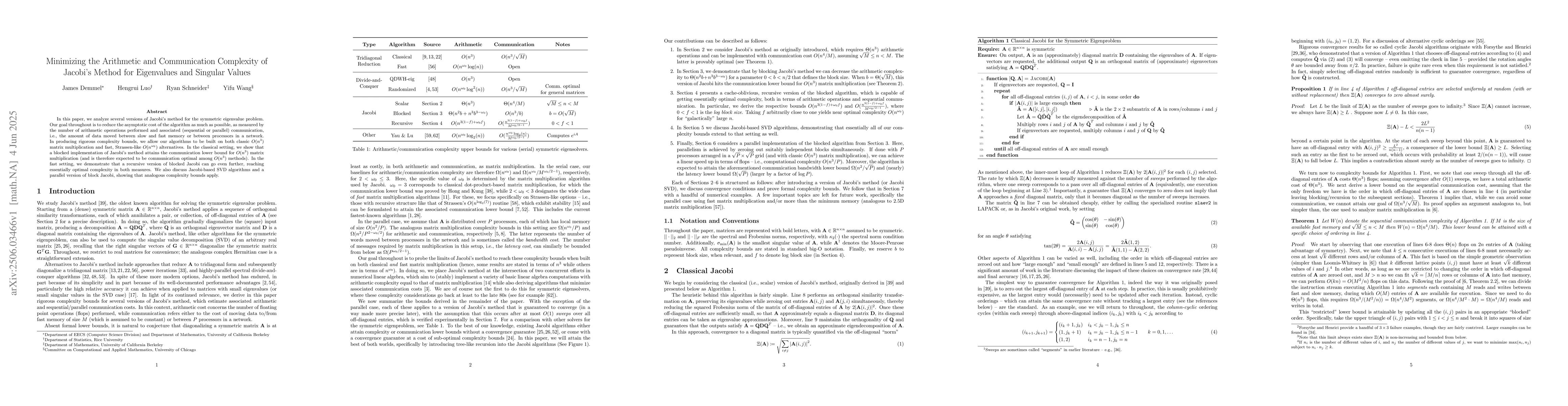 The paper analyzes various versions of Jacobi's method for symmetric eigenvalue problems, focusing on minimizing arithmetic and communication complexity. It considers both classic O(n^3) matrix multiplication and faster Strassen-like O(n^ω₀) alternatives to derive rigorous complexity bounds.