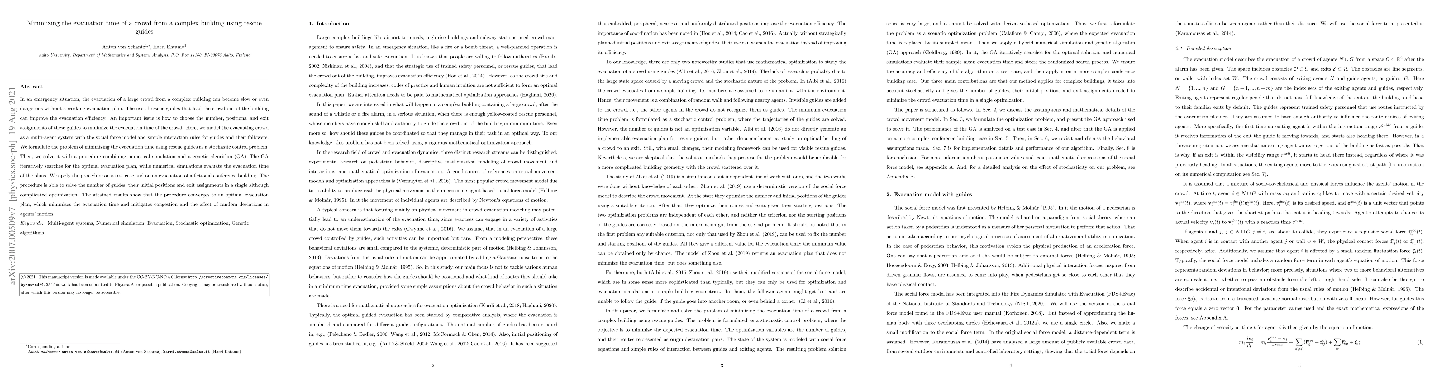 This paper proposes a method to minimize crowd evacuation time from complex buildings using rescue guides. It employs a stochastic control problem approach, combining numerical simulations and a genetic algorithm to optimize the number, positions, and exit assignments of guides, achieving an optimal evacuation plan that reduces congestion and random deviations.