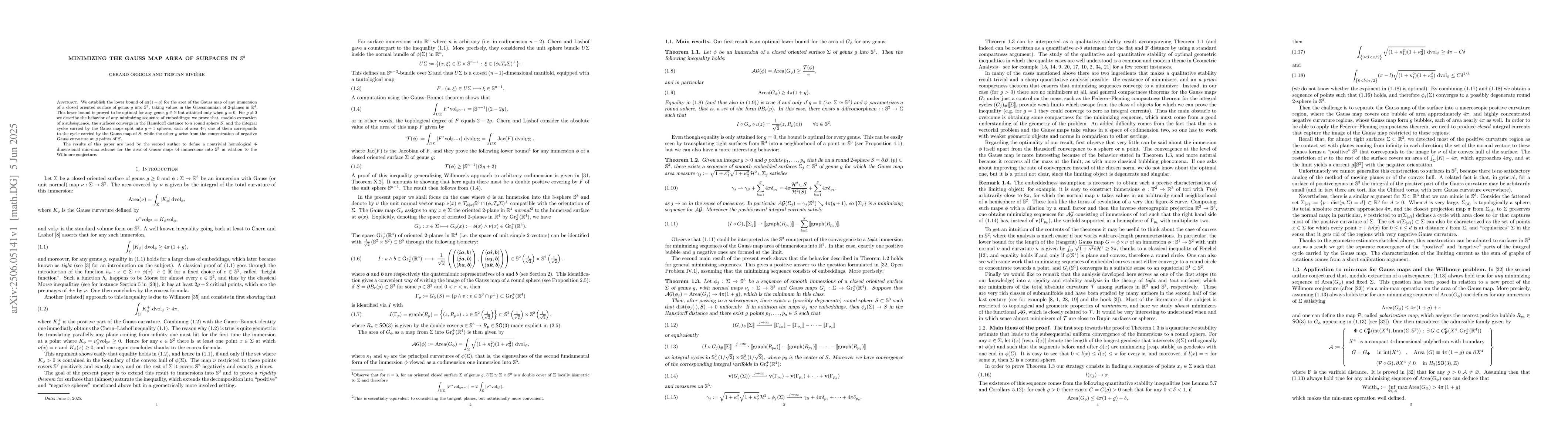 The paper establishes a lower bound for the Gauss map area of immersions of closed oriented surfaces of genus g into S³, using Grassmannian 2-plane configurations in R⁴.