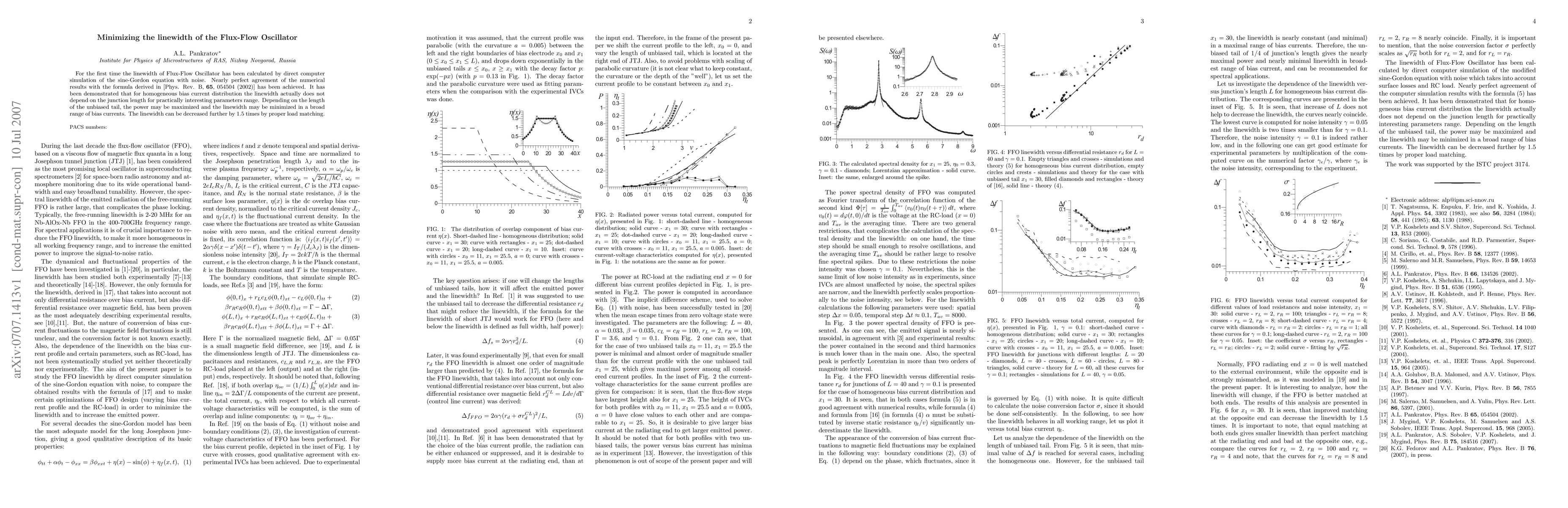 For the first time the linewidth of Flux-Flow Oscillator has been calculated by direct computer simulation of the sine-Gordon equation with noise. Nearly perfect agreement of the numerical results with the formula derived in [Phys. Rev. B, {\bf 65}, 054504 (2002)] has been achieved. It has been demonstrated that for homogeneous bias current distribution the linewidth actually does not depend on the junction length for practically interesting parameters range. Depending on the length of the unbiased tail, the power may be maximized and the linewidth may be minimized in a broad range of bias currents. The linewidth can be decreased further by 1.5 times by proper load matching.