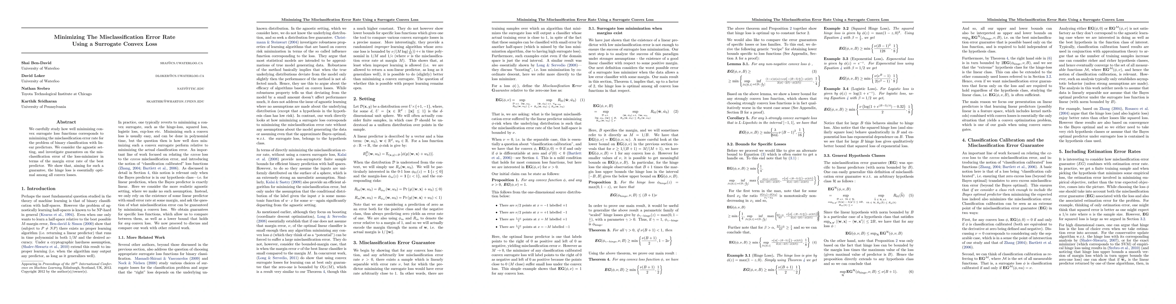 The paper analyzes how well minimizing convex surrogate loss functions corresponds to minimizing the misclassification error rate for binary classification with linear predictors, focusing on the hinge loss.