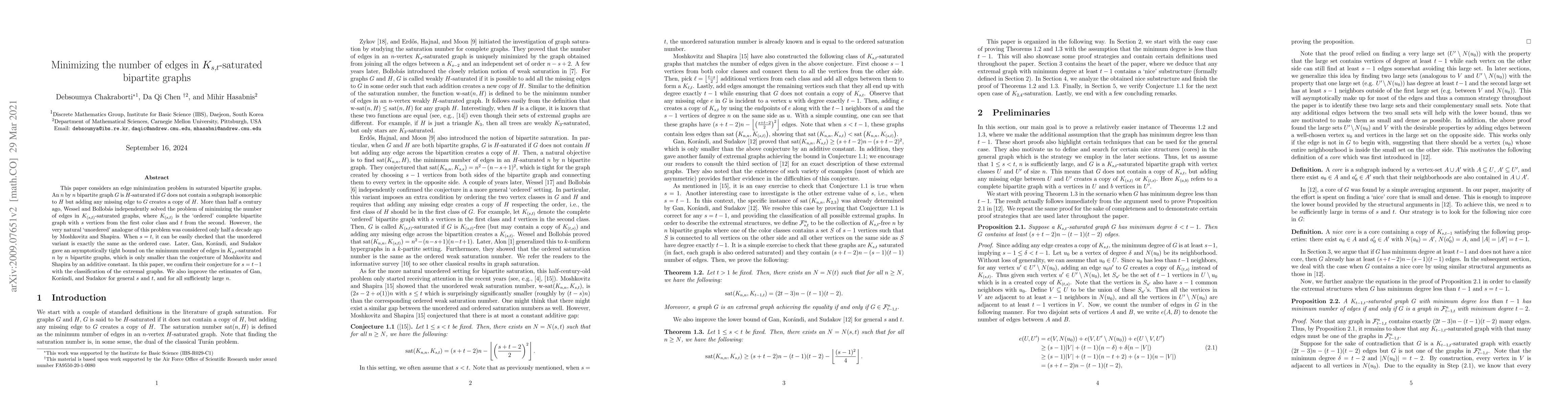 This paper addresses the edge minimization problem in $K_{s,t}$-saturated bipartite graphs, confirming the conjecture for $s=t-1$ and classifying extremal graphs. It also improves upon existing estimates for general $s$ and $t$, especially for large $n$.
