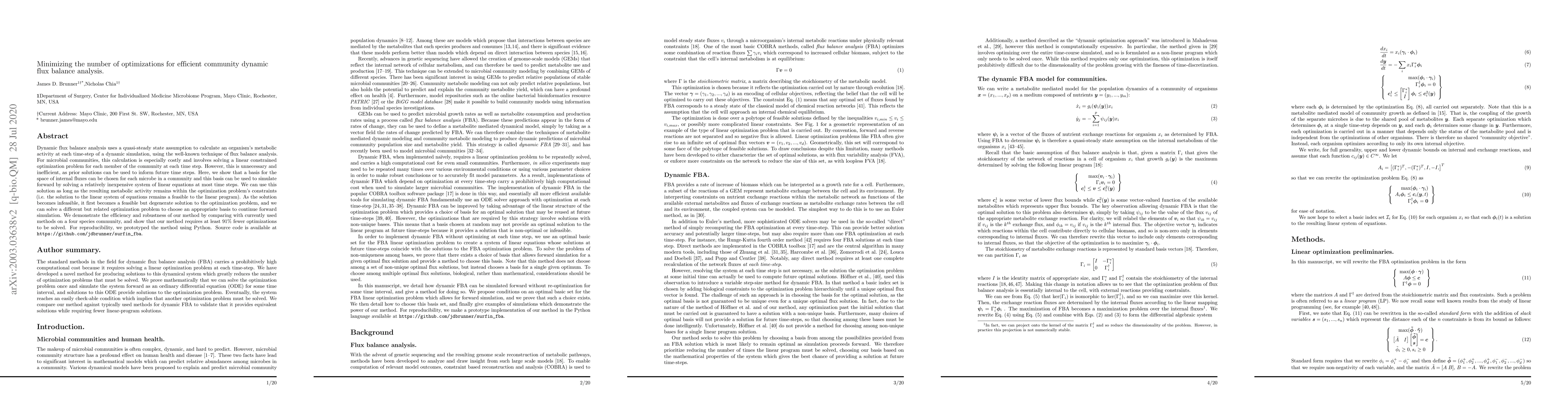This paper proposes a method to minimize the number of optimizations in dynamic flux balance analysis for microbial communities by using a basis for internal fluxes, reducing the need for solving linear optimization problems at each time step. The method efficiently simulates forward by solving a system of linear equations, switching to optimization only when necessary, resulting in at least 91% fewer optimizations compared to current methods.
