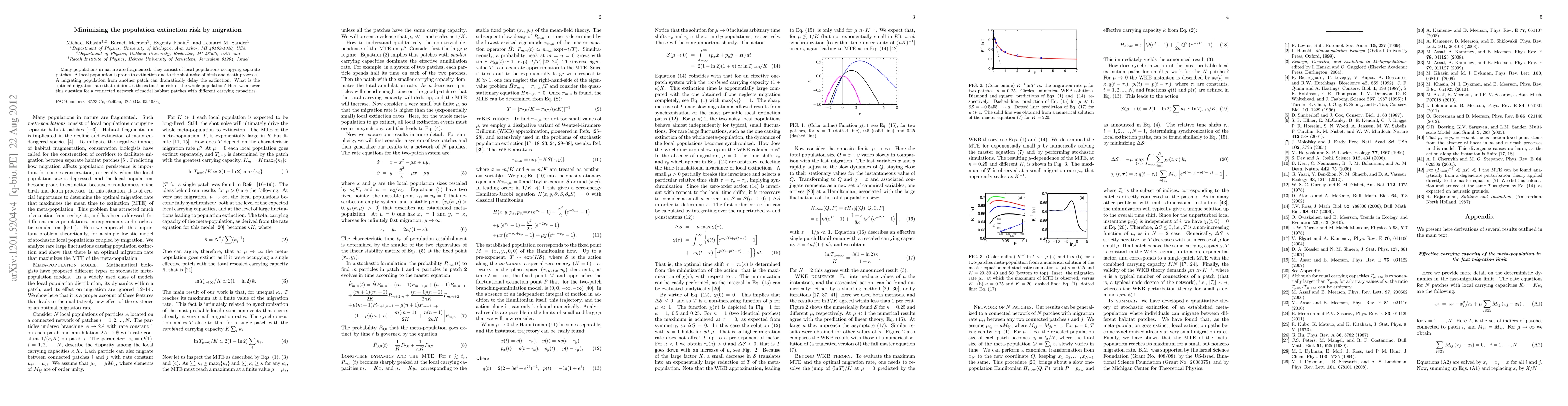 Many populations in nature are fragmented: they consist of local populations occupying separate patches. A local population is prone to extinction due to the shot noise of birth and death processes. A migrating population from another patch can dramatically delay the extinction. What is the optimal migration rate that minimizes the extinction risk of the whole population? Here we answer this question for a connected network of model habitat patches with different carrying capacities.