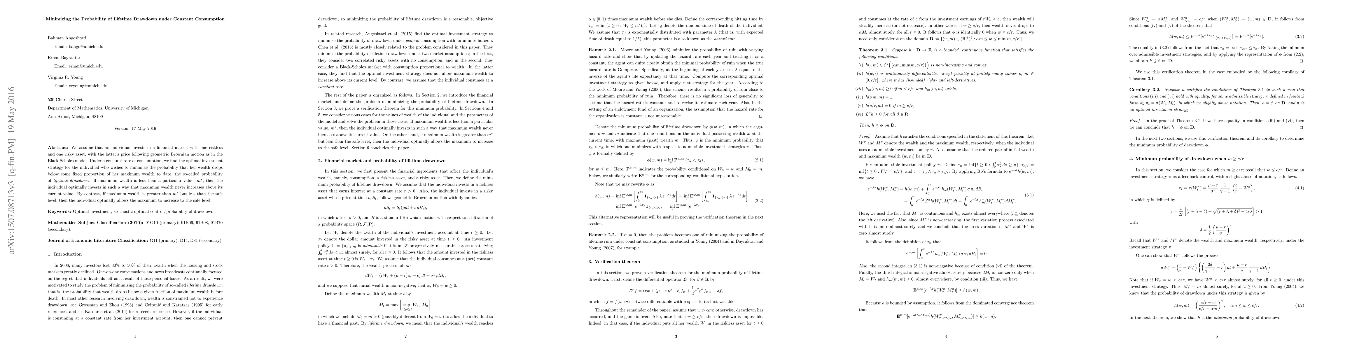 We assume that an individual invests in a financial market with one riskless and one risky asset, with the latter's price following geometric Brownian motion as in the Black-Scholes model. Under a constant rate of consumption, we find the optimal investment strategy for the individual who wishes to minimize the probability that her wealth drops below some fixed proportion of her maximum wealth to date, the so-called probability of {\it lifetime drawdown}. If maximum wealth is less than a particular value, $m^*$, then the individual optimally invests in such a way that maximum wealth never increases above its current value. By contrast, if maximum wealth is greater than $m^*$ but less than the safe level, then the individual optimally allows the maximum to increase to the safe level.