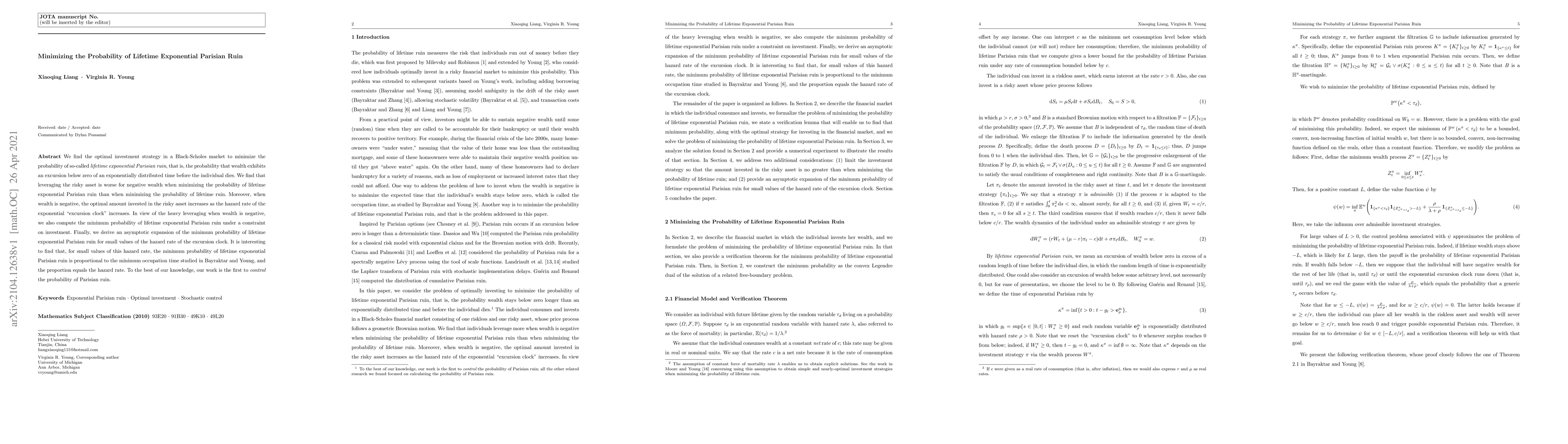 We find the optimal investment strategy in a Black-Scholes market to minimize the probability of so-called {\it lifetime exponential Parisian ruin}, that is, the probability that wealth exhibits an excursion below zero of an exponentially distributed time before the individual dies. We find that leveraging the risky asset is worse for negative wealth when minimizing the probability of lifetime exponential Parisian ruin than when minimizing the probability of lifetime ruin. Moreover, when wealth is negative, the optimal amount invested in the risky asset increases as the hazard rate of the exponential ``excursion clock'' increases. In view of the heavy leveraging when wealth is negative, we also compute the minimum probability of lifetime exponential Parisian ruin under a constraint on investment. Finally, we derive an asymptotic expansion of the minimum probability of lifetime exponential Parisian ruin for small values of the hazard rate of the excursion clock. It is interesting to find that, for small values of this hazard rate, the minimum probability of lifetime exponential Parisian ruin is proportional to the minimum occupation time studied in Bayraktar and Young, and the proportion equals the hazard rate. To the best of our knowledge, our work is the first to {\it control} the probability of Parisian ruin.