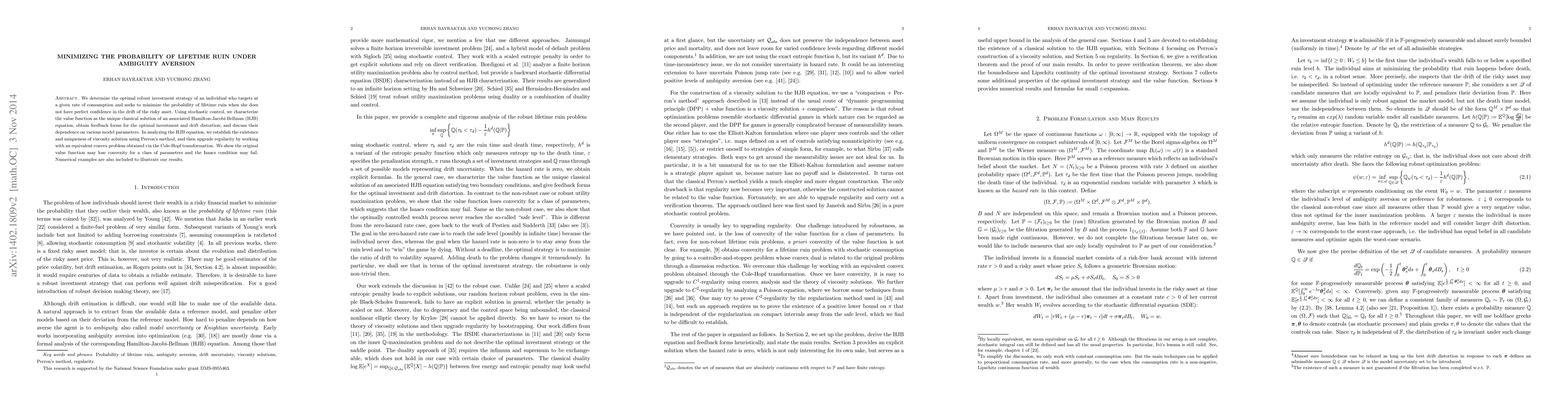 This paper develops a robust investment strategy to minimize lifetime ruin probability under ambiguity aversion, characterized by a Hamilton-Jacobi-Bellman equation. It establishes the existence and uniqueness of the value function solution and discusses the optimal investment and drift distortion strategies, highlighting potential loss of convexity and failure of the Isaacs condition for certain parameters.