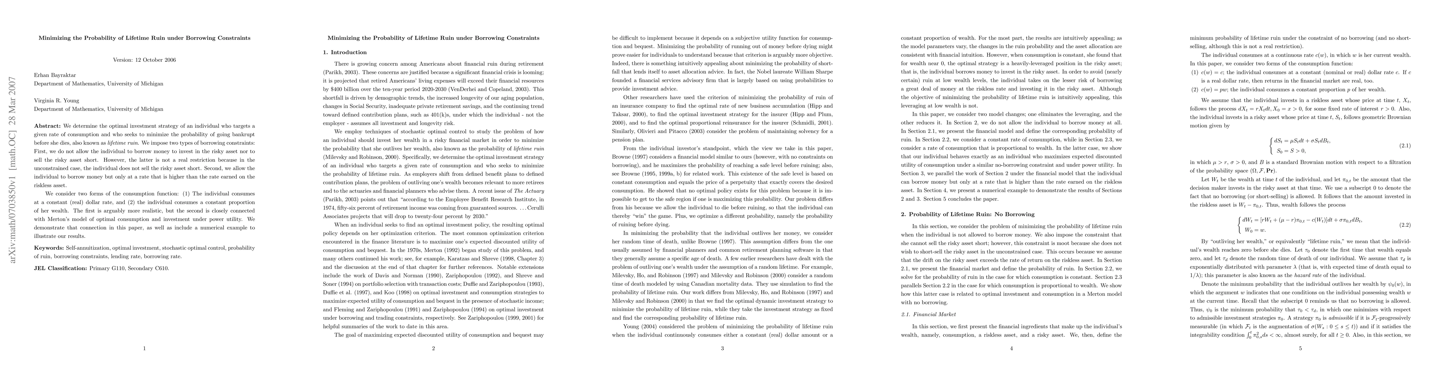 This paper explores the optimal investment strategy for an individual aiming to minimize the probability of lifetime ruin under borrowing constraints, considering both constant dollar and proportional consumption models. It also connects these models to Merton's optimal consumption theory and provides a numerical example to illustrate the findings.