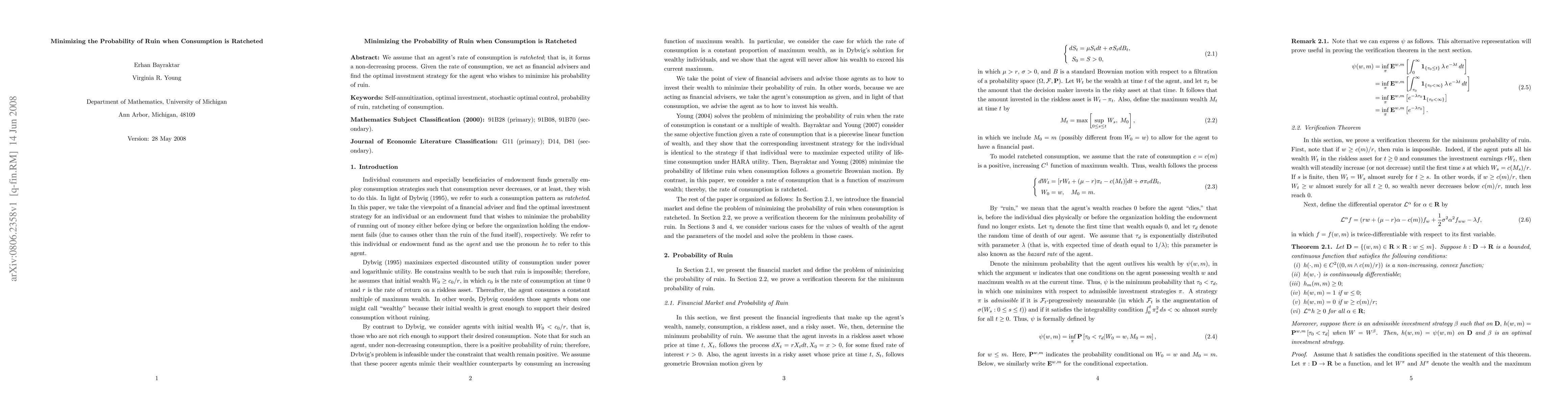 We assume that an agent's rate of consumption is {\it ratcheted}; that is, it forms a non-decreasing process. Given the rate of consumption, we act as financial advisers and find the optimal investment strategy for the agent who wishes to minimize his probability of ruin.