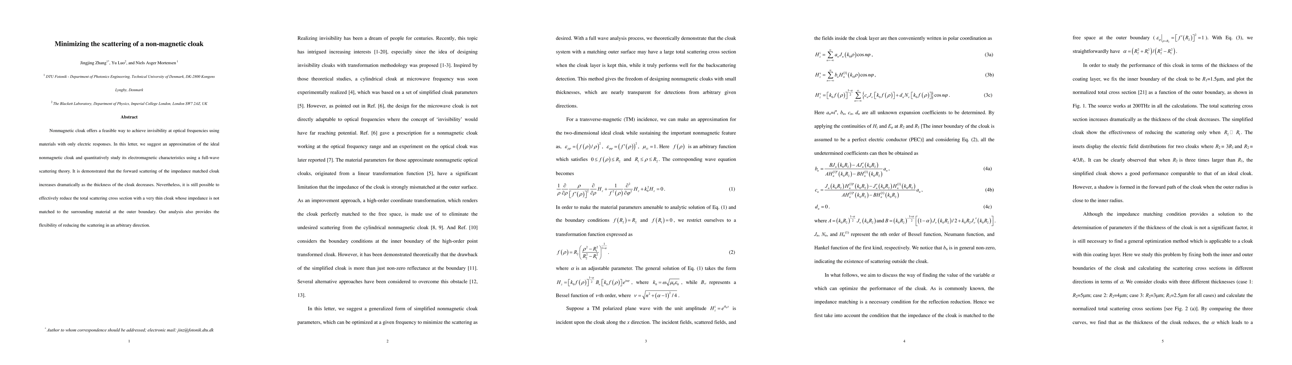 This paper proposes an approximation for a nonmagnetic cloak that minimizes scattering at optical frequencies. It demonstrates that while thinner cloaks increase forward scattering, a non-impedance matched cloak can effectively reduce total scattering, even in specific directions.