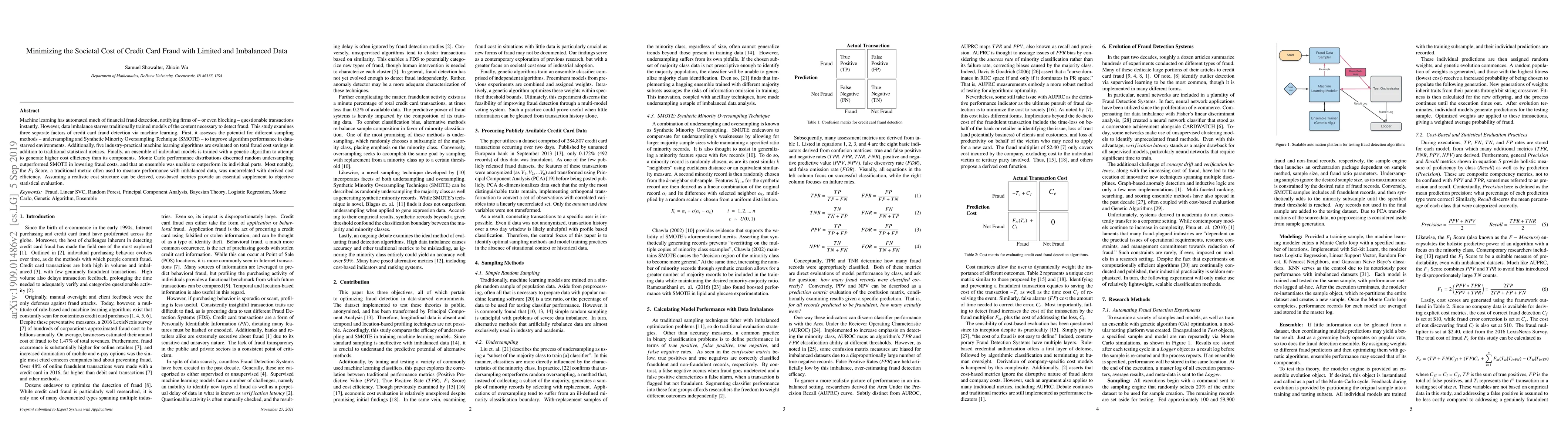 A study found that random undersampling outperforms Synthetic Minority Oversampling Technique (SMOTE) in reducing credit card fraud costs, and that a genetic algorithm-based ensemble model cannot outperform its individual parts.