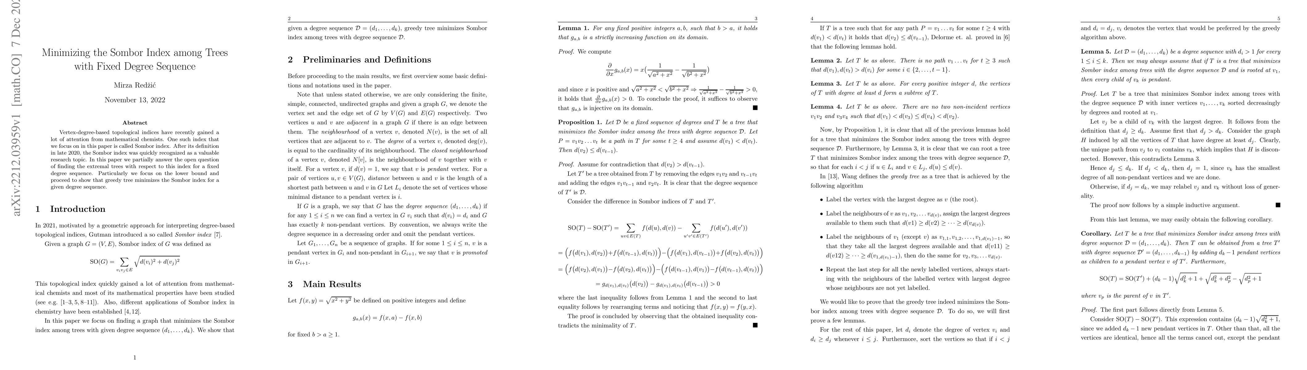 This paper investigates the Sombor index, a recently defined vertex-degree-based topological index, focusing on finding extremal trees with respect to this index for a fixed degree sequence. It demonstrates that, among trees with a given degree sequence, the greedy tree minimizes the Sombor index.