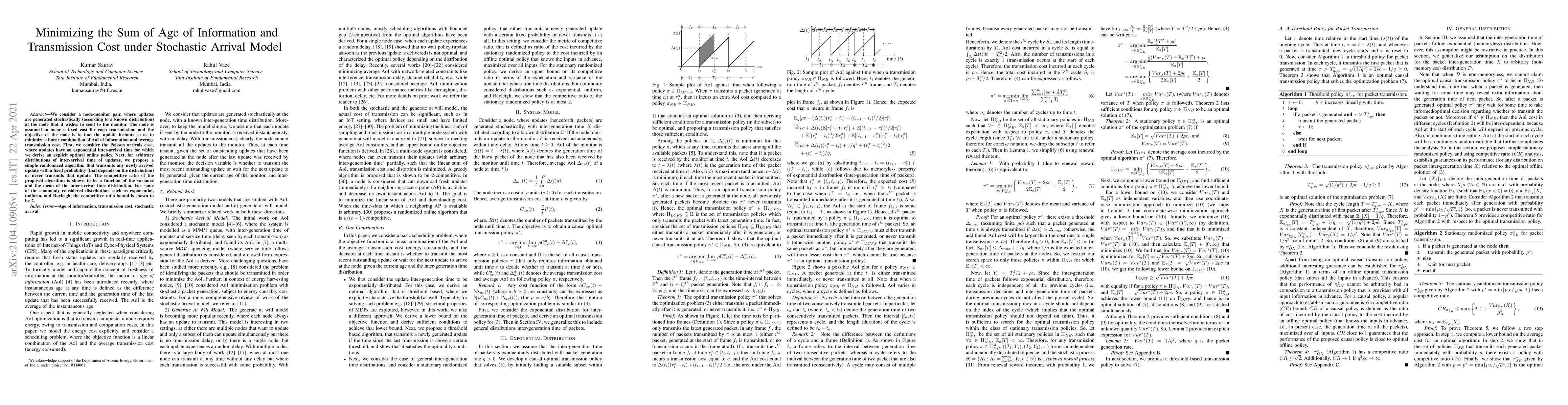 We consider a node-monitor pair, where updates are generated stochastically (according to a known distribution) at the node that it wishes to send to the monitor. The node is assumed to incur a fixed cost for each transmission, and the objective of the node is to find the update instants so as to minimize a linear combination of AoI of information and average transmission cost. First, we consider the Poisson arrivals case, where updates have an exponential inter-arrival time for which we derive an explicit optimal online policy. Next, for arbitrary distributions of inter-arrival time of updates, we propose a simple randomized algorithm that transmits any newly arrived update with a fixed probability (that depends on the distribution) or never transmits that update. The competitive ratio of the proposed algorithm is shown to be a function of the variance and the mean of the inter-arrival time distribution. For some of the commonly considered distributions such as exponential, uniform, and Rayleigh, the competitive ratio bound is shown to be 2.