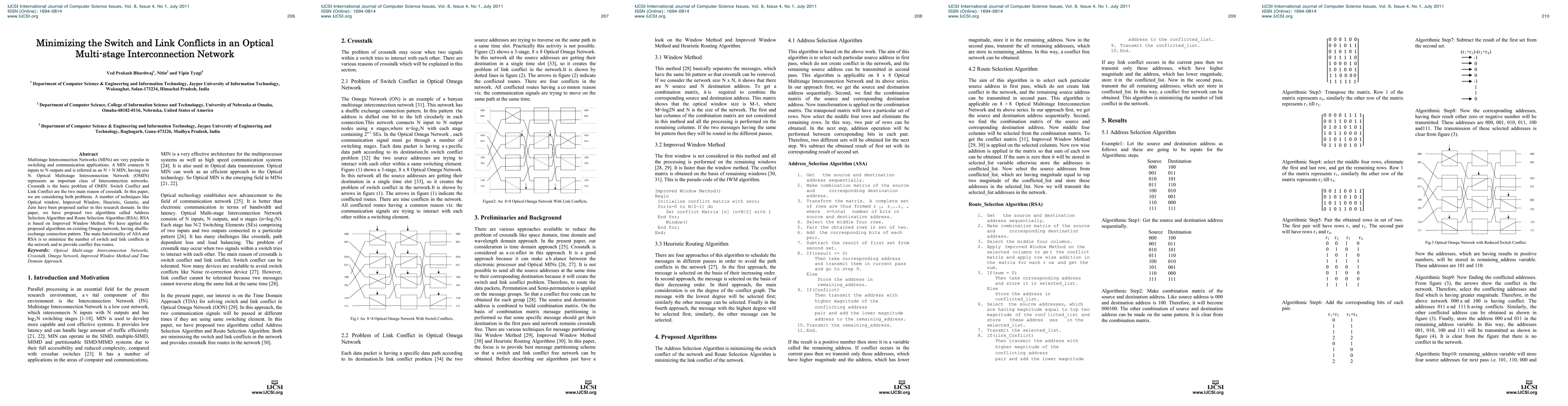 Multistage Interconnection Networks (MINs) are very popular in switching and communication applications. A MIN connects N inputs to N outputs and is referred as an N \times N MIN; having size N. Optical Multistage Interconnection Network (OMIN) represents an important class of Interconnection networks. Crosstalk is the basic problem of OMIN. Switch Conflict and Link Conflict are the two main reason of crosstalk. In this paper, we are considering both problems. A number of techniques like Optical window, Improved Window, Heuristic, Genetic, and Zero have been proposed earlier in this research domain. In this paper, we have proposed two algorithms called Address Selection Algorithm and Route Selection Algorithm (RSA). RSA is based on Improved Window Method. We have applied the proposed algorithms on existing Omega network, having shuffle-exchange connection pattern. The main functionality of ASA and RSA is to minimize the number of switch and link conflicts in the network and to provide conflict free routes.